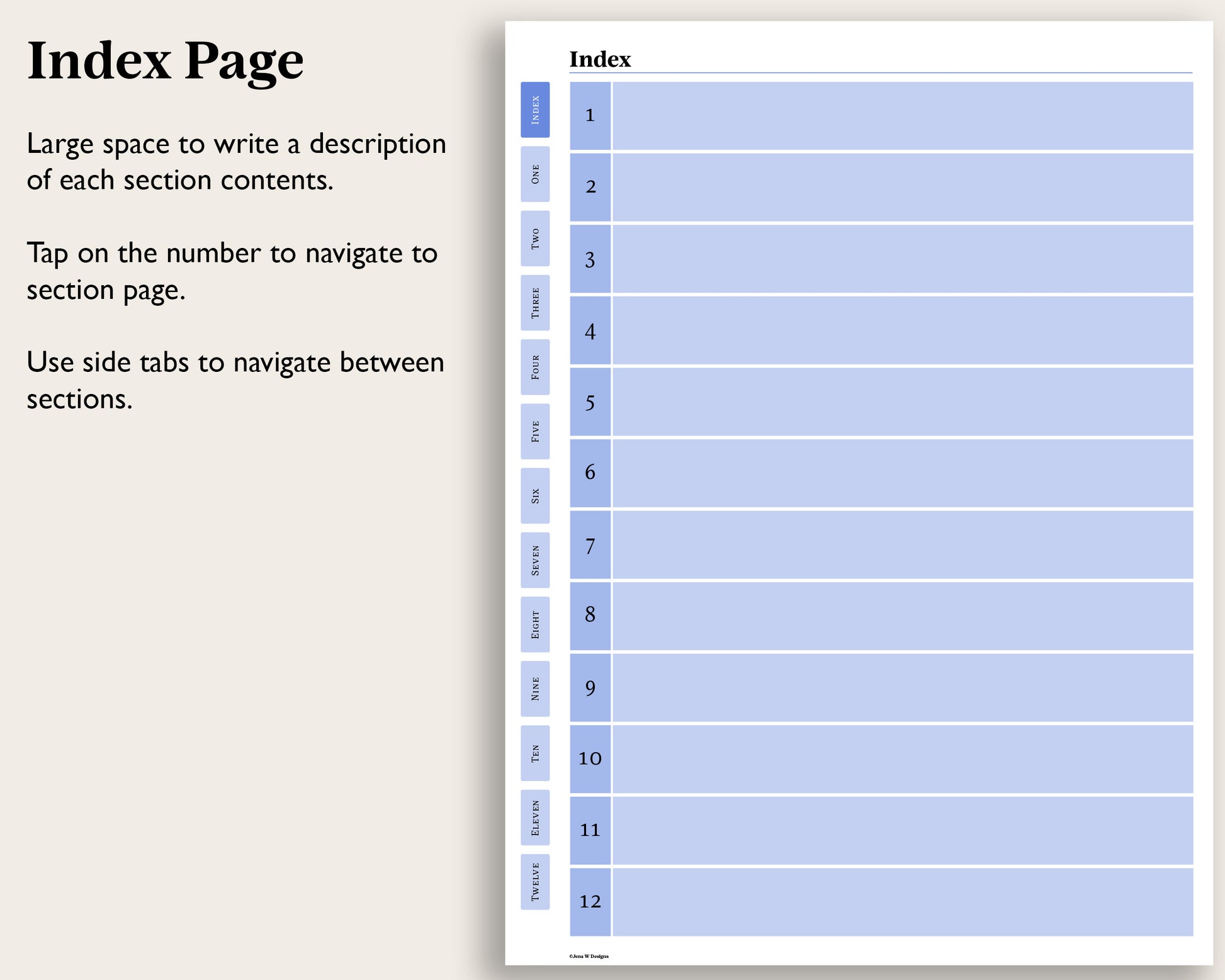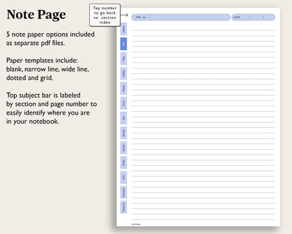 With 12 custom sections and 31 linked pages per section, you'll have 372 pages to capture your ideas with ease. Choose from five paper templates (blank, narrow rule, wide rule, dotted, and grid) to match your note-taking style. Each section is clearly labeled and designed for fast, seamless navigation, ensuring you stay focused on what matters most.