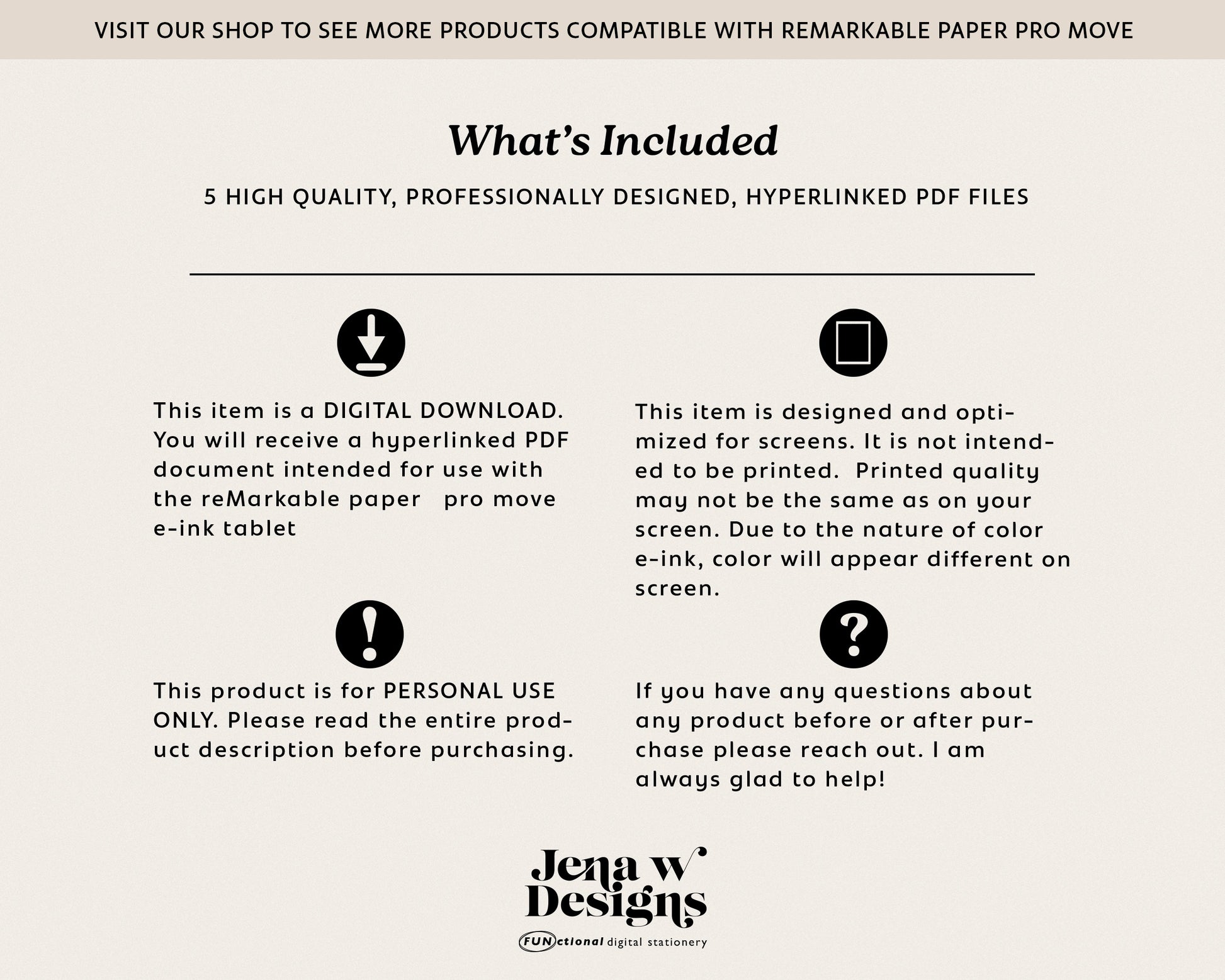 Boost your productivity and stay organized with this fully hyperlinked digital notebook, compatible with the Remarkable Paper Pro Move. Perfect for students, professionals, and anyone looking to take effective notes, this notebook is ideal for class notes, meeting minutes, brainstorming, daily journaling, and more.