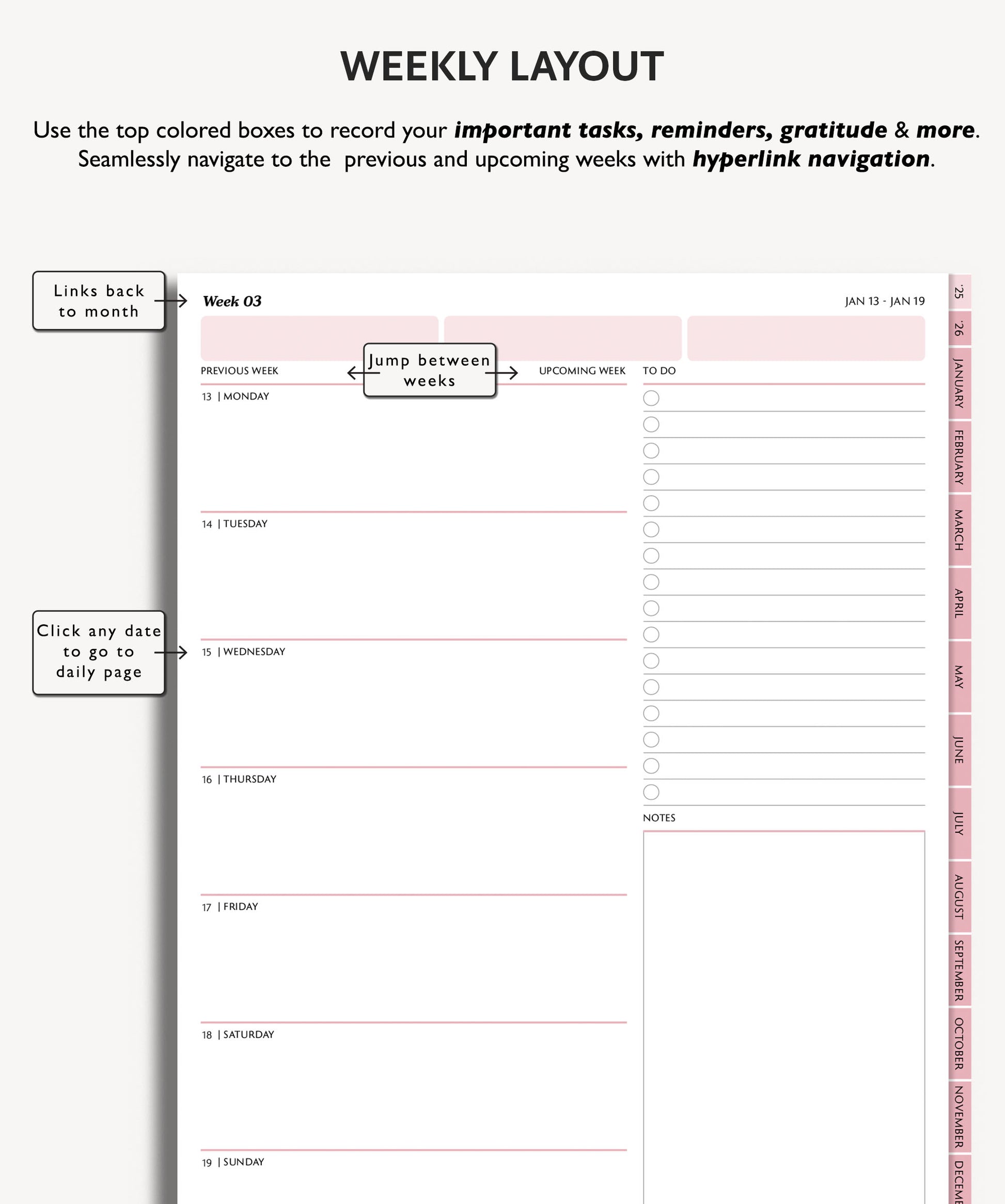 - Seamless Navigation: Quickly access hyperlinked weeks and daily pages.