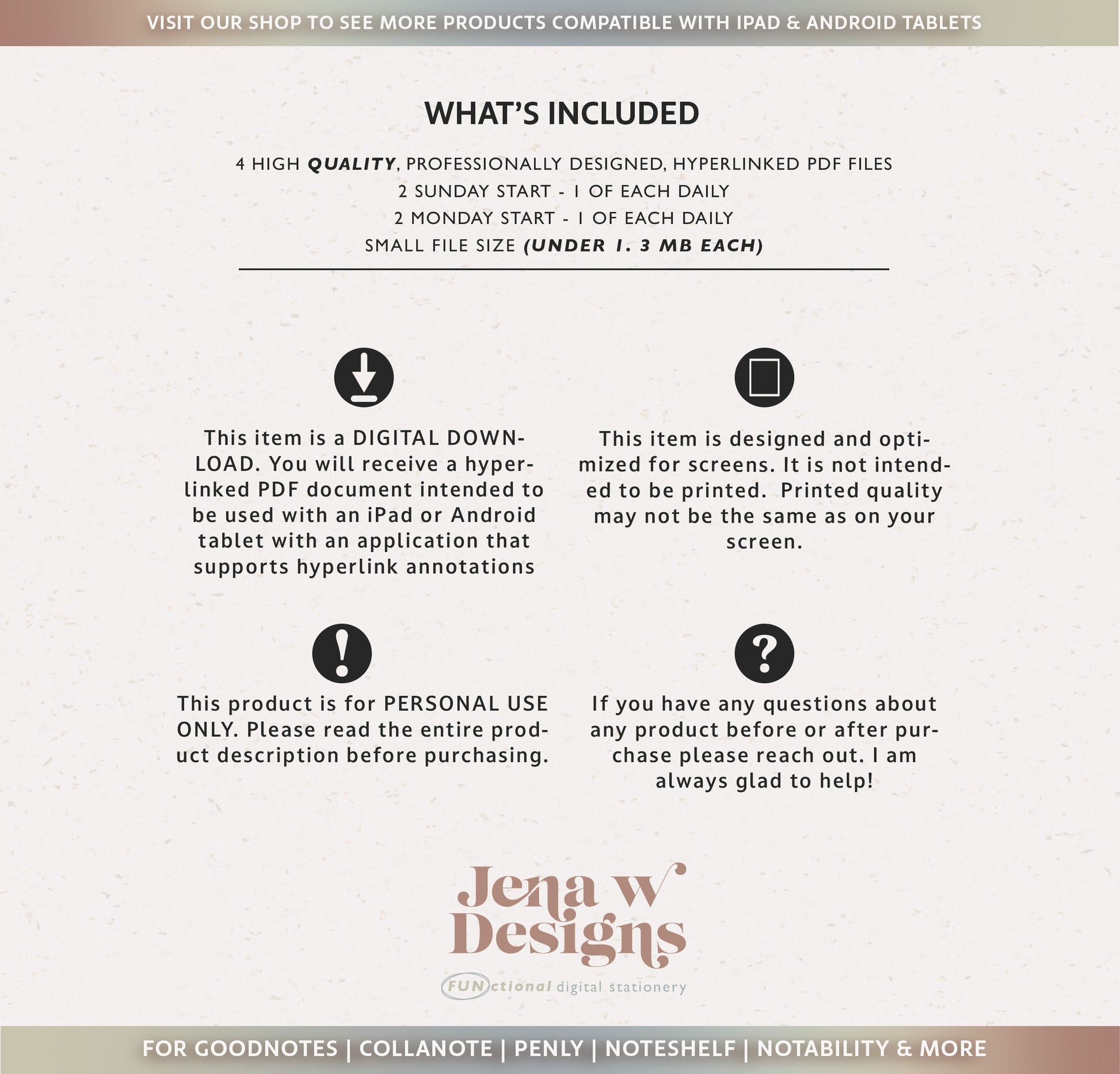 - 4 hyperlinked pdf files of your digital planner ( 2 Sunday and 2 Monday Start) to use in your preferred annotated hyperlink app such as GoodNotes. Review the compatibility tab if you would like to learn more about apps that work with digital pdf templates.