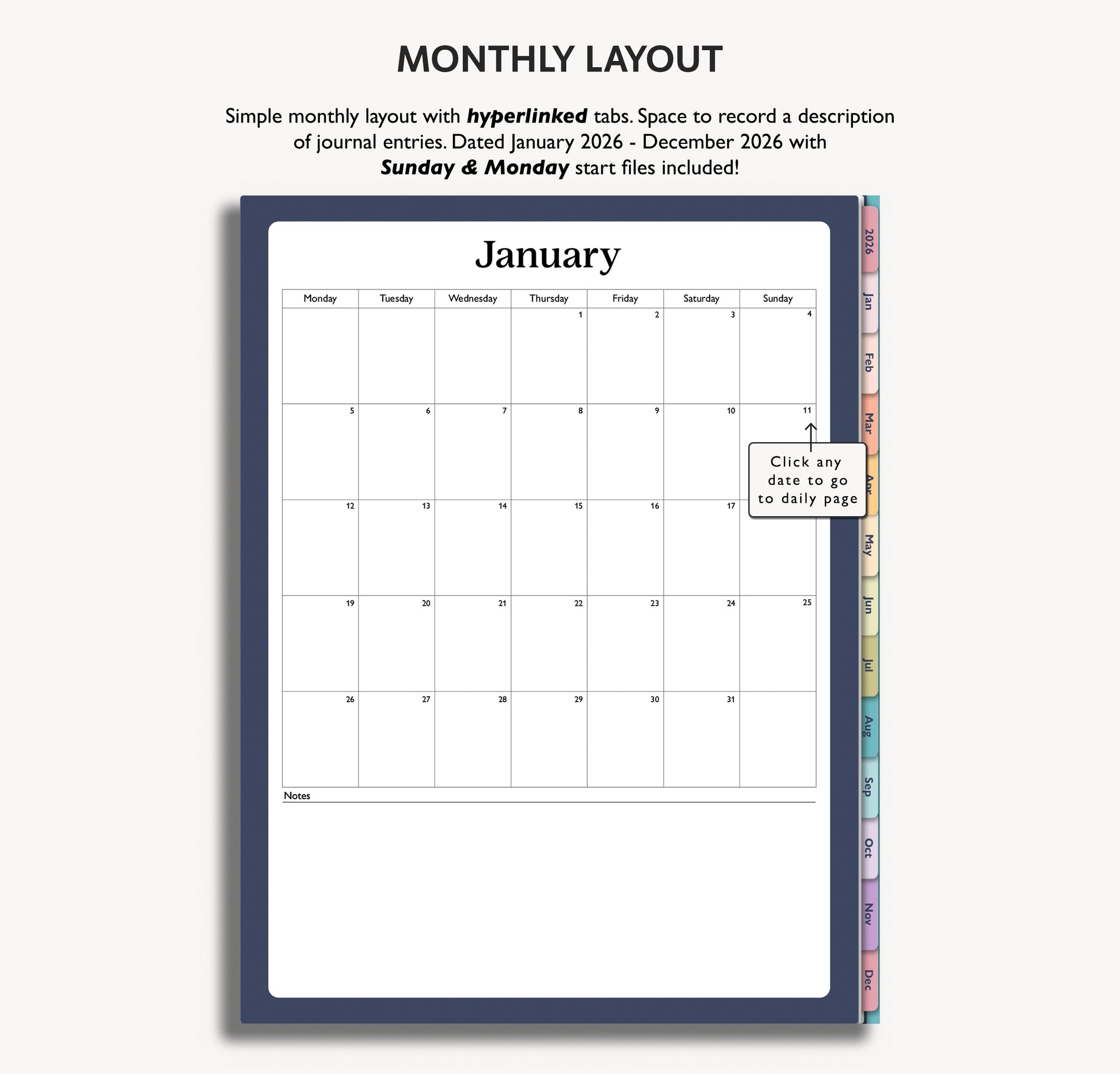 Journal in 2026 with a fully hyperlinked digital journal for your iPad. This daily journal has hyperlink navigation to quickly jump to the daily page you need. The monthly calendar has space to record a brief description of your journal entry so you can go back and find the entry you are looking for!