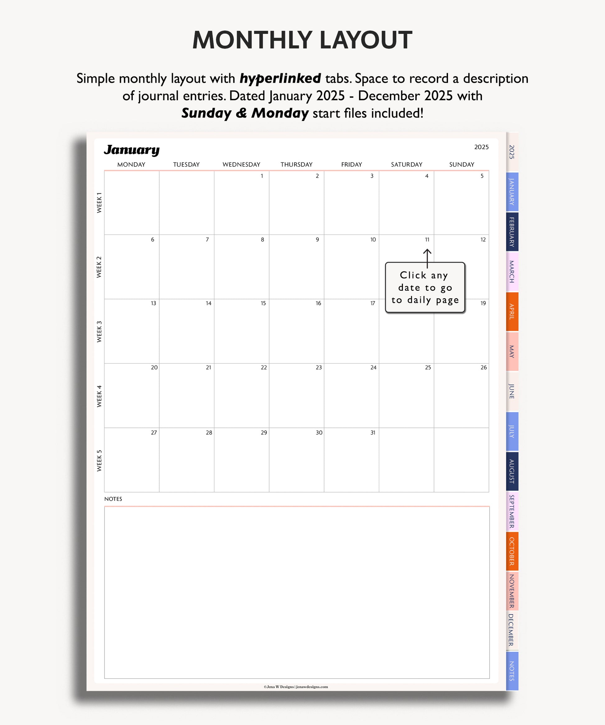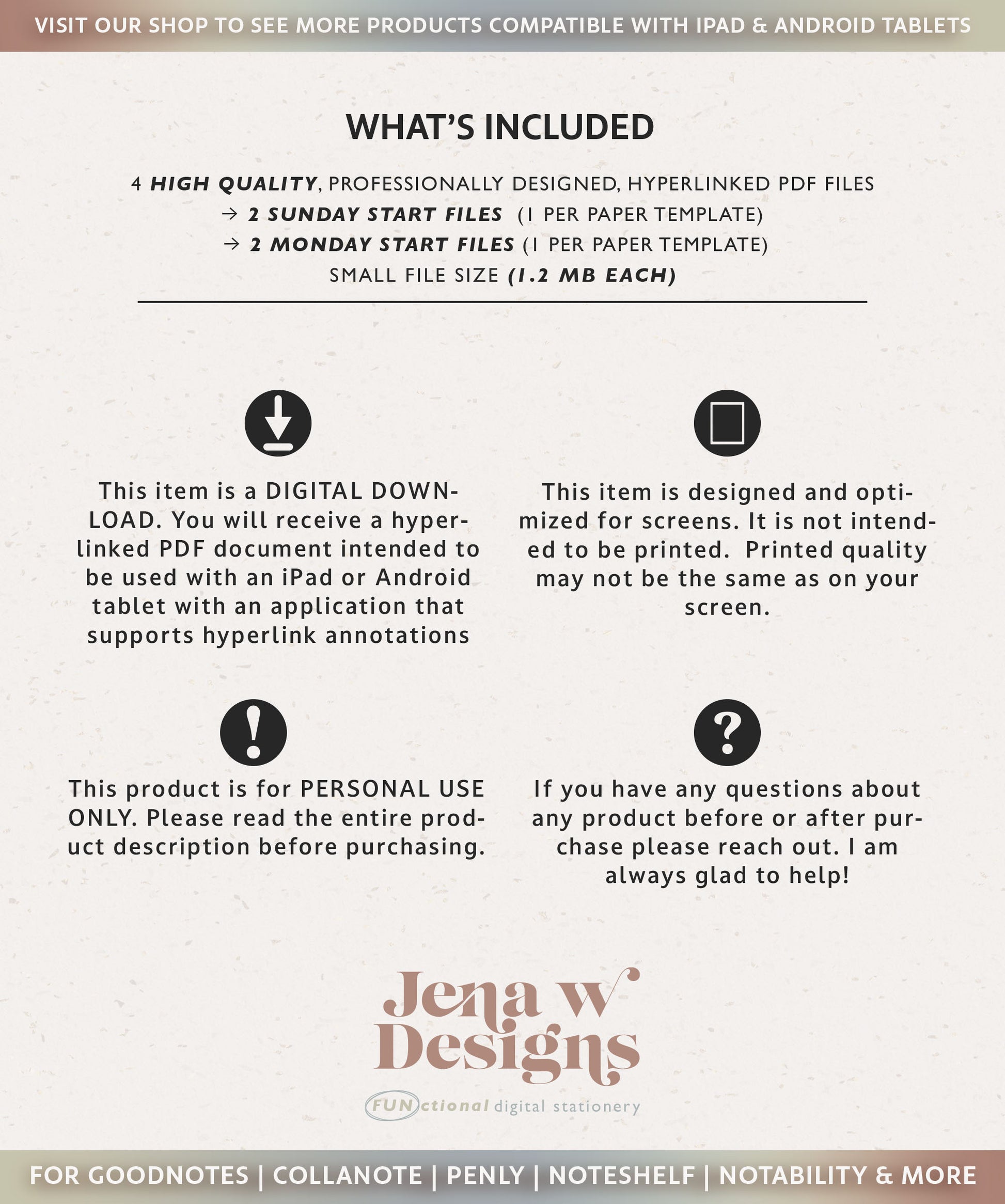 - 4 hyperlinked pdf files of your digital planner ( 2 Sunday and 2 Monday Start) to use in your preferred annotated hyperlink app such as GoodNotes. Review the compatibility tab if you would like to learn more about apps that work with digital pdf templates.