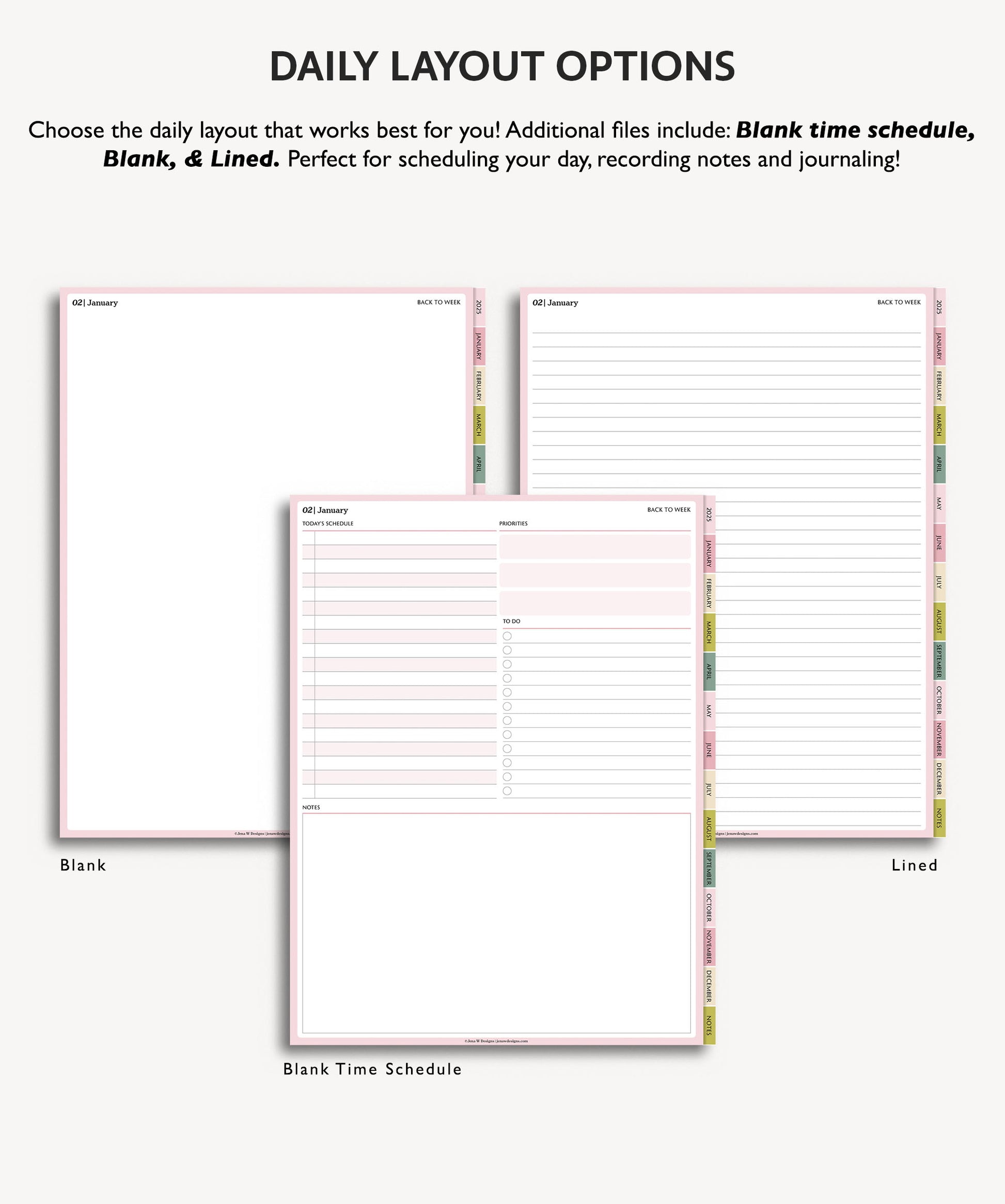 - 4 daily layout files to choose from (Narrow Rule, Blank, Schedule with pre-filled time and Schedule with blank time slots