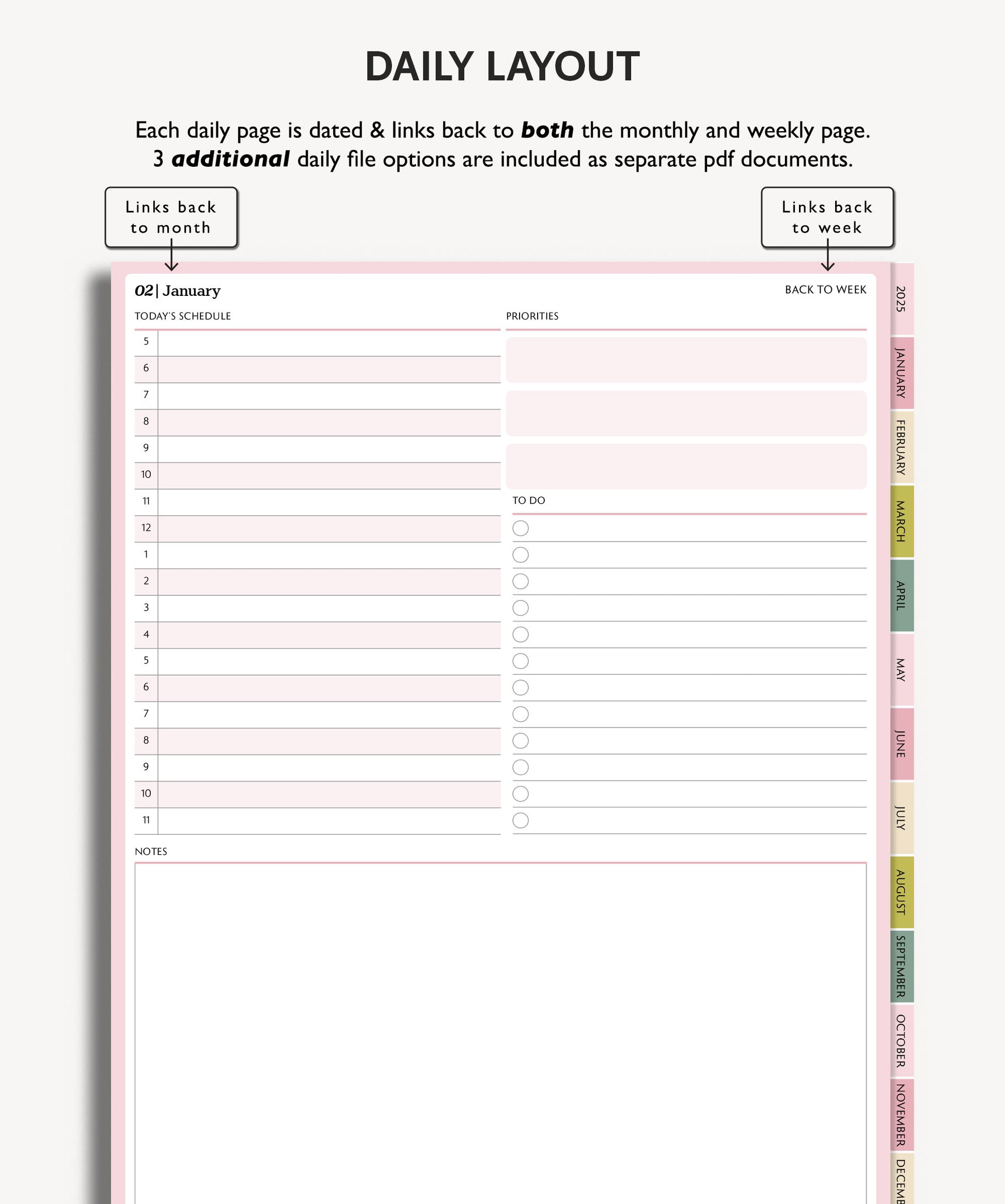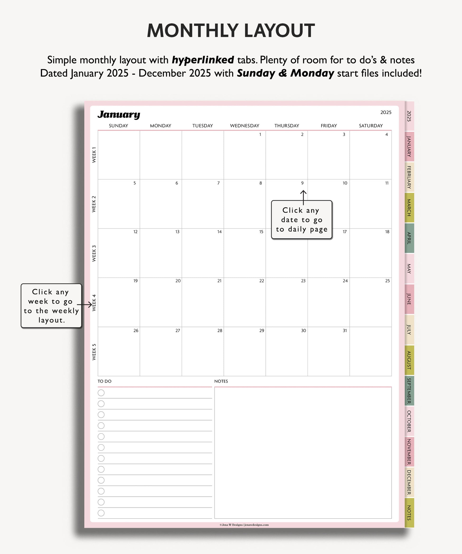 This straightforward and simple 2025 daily digital planner includes monthly, weekly, and daily layouts that are clean and minimal for efficient and effective planning. With a pleasing and simplistic design, it only includes the necessary planning pages without any overwhelming features.