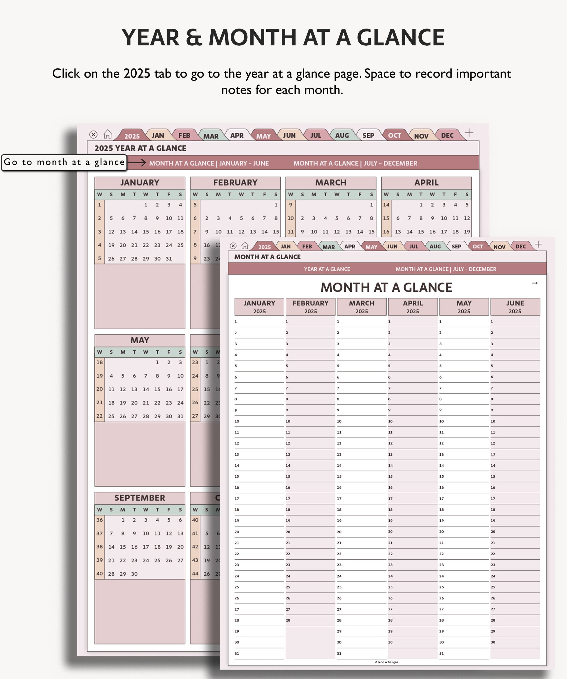 - Hyperlinked year at a glance calendar & month at a glance pages for 2025