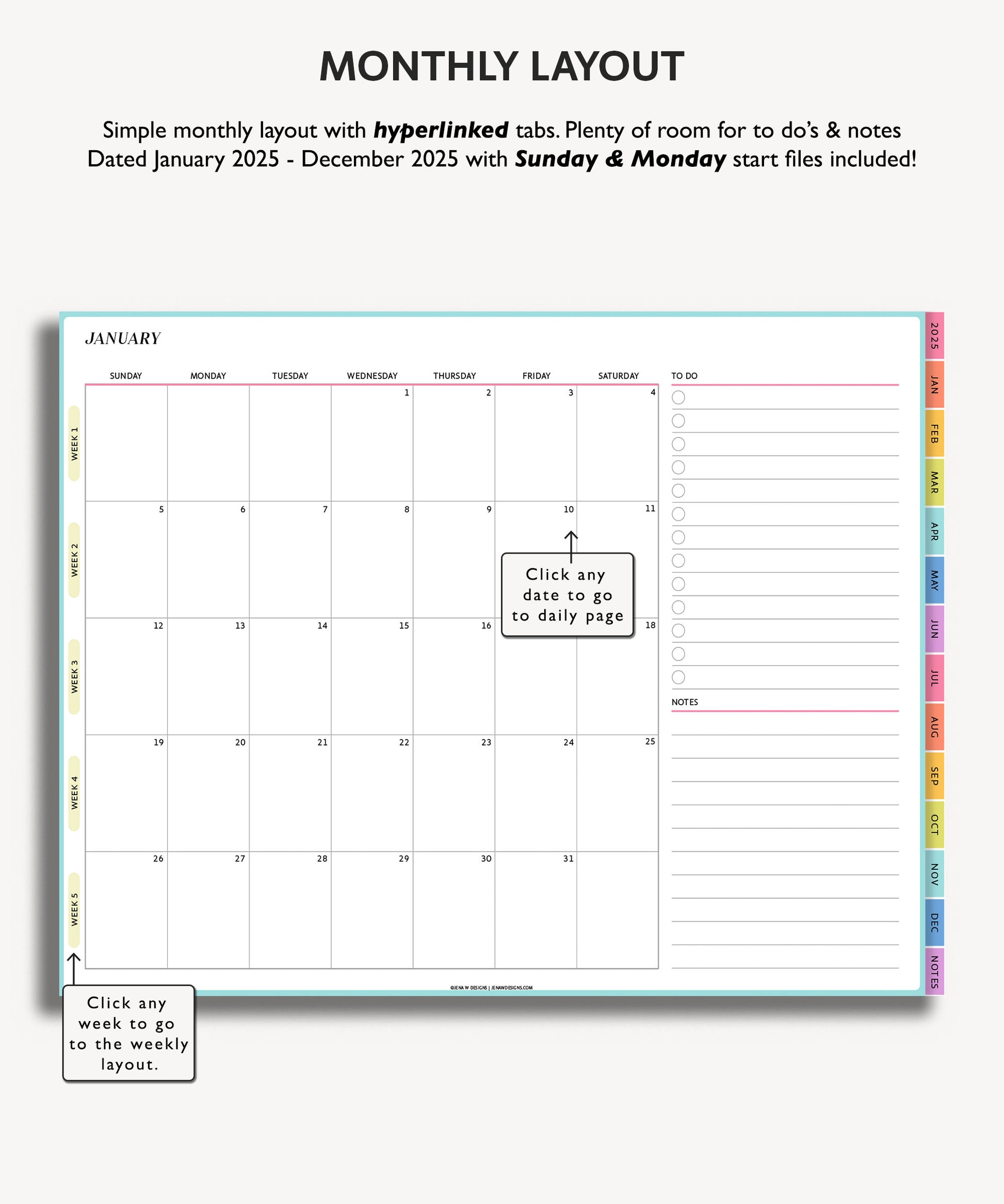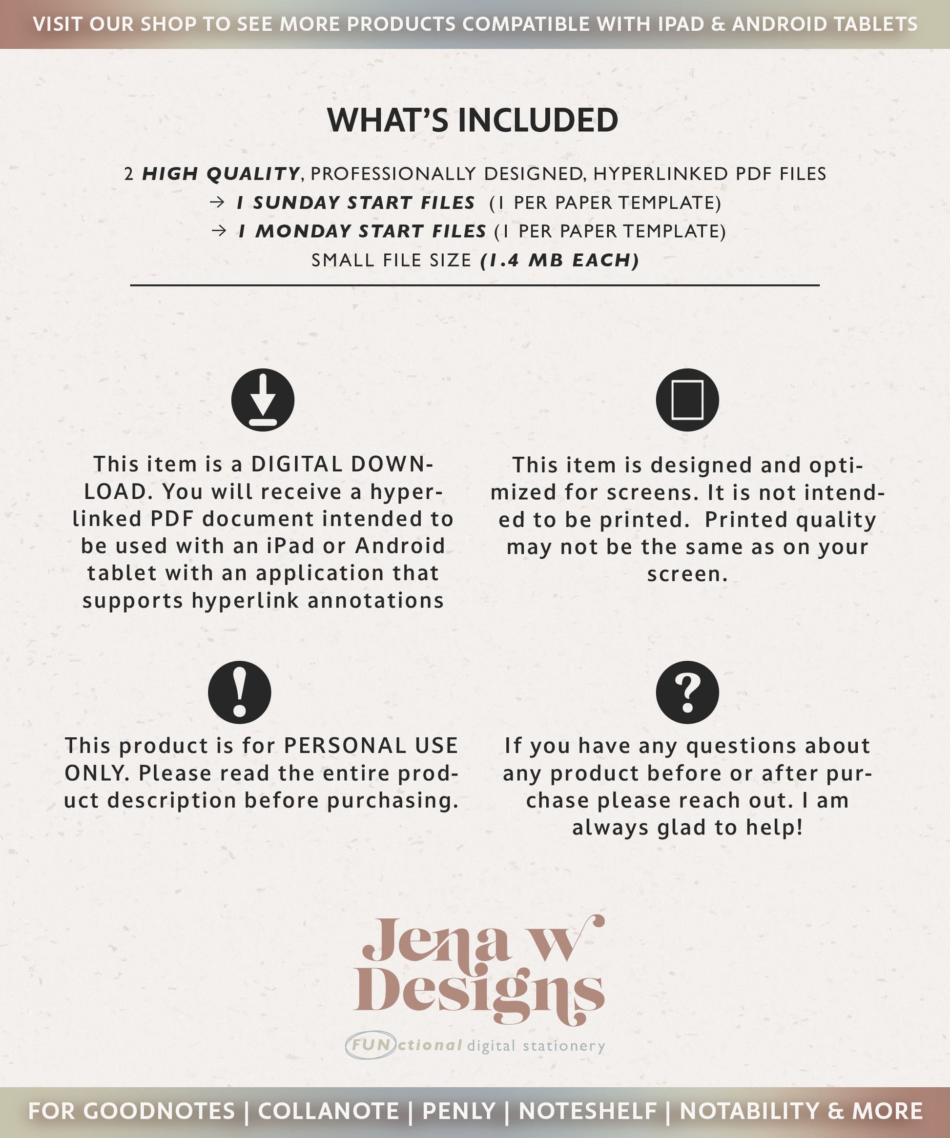 - 2 hyperlinked pdf files of your digital planner ( 1 Sunday and 1 Monday Start) to use in your preferred annotated hyperlink app such as GoodNotes. Review the compatibility tab if you would like to learn more about apps that work with digital pdf templates.