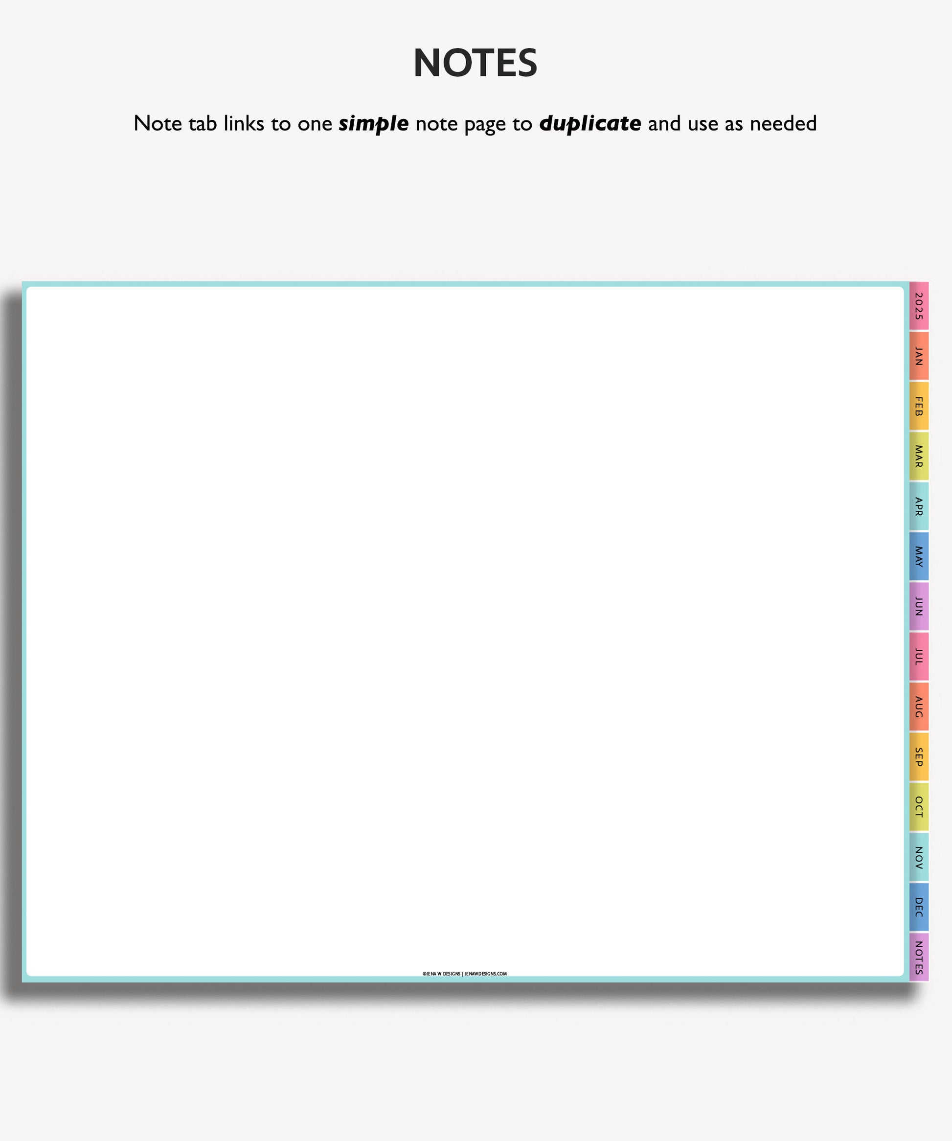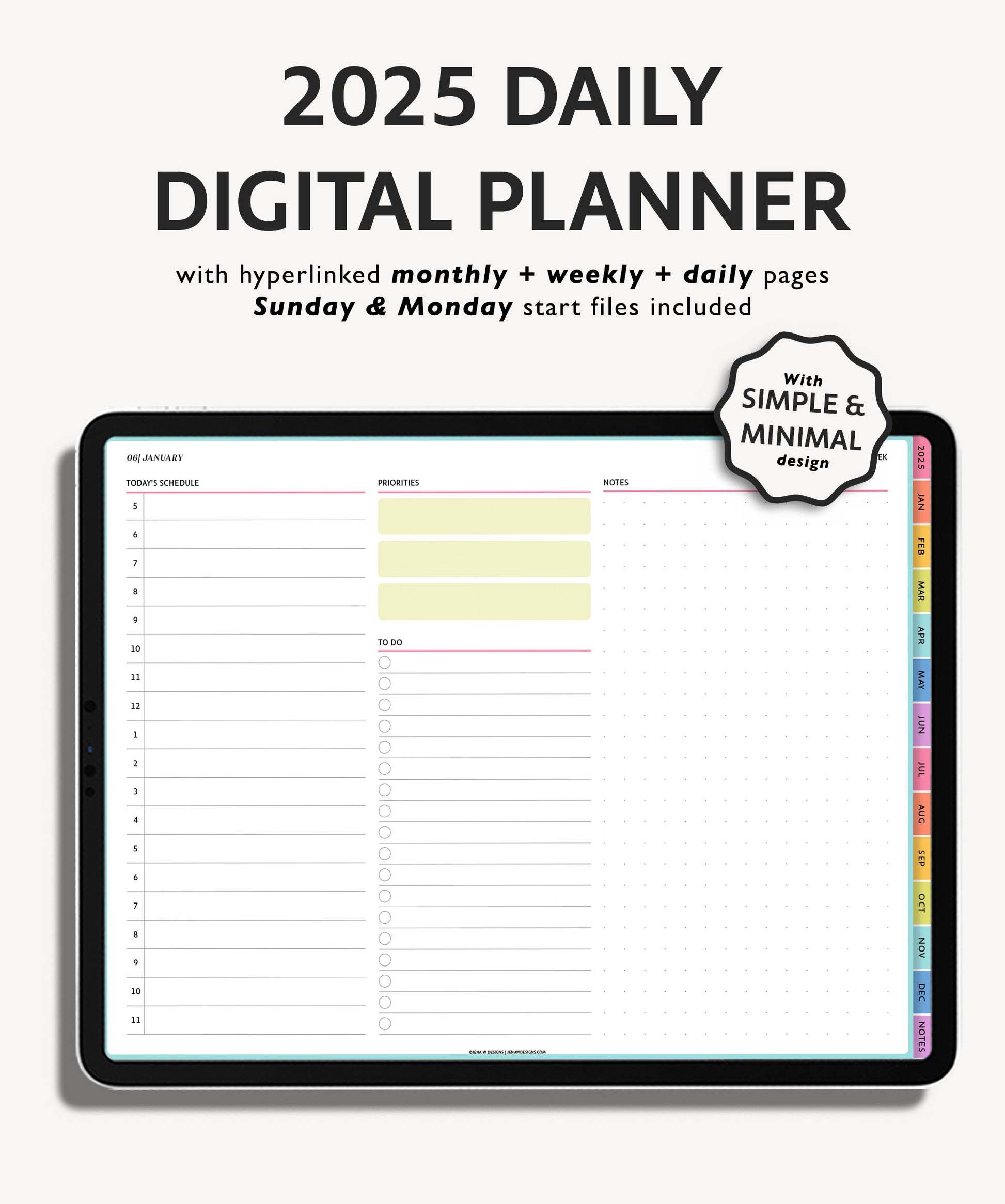 Stay organized all year with the 2025 Simple Daily Digital Planner, designed for iPad and Android tablets. This planner features hyperlinked, minimalist monthly, weekly, and daily pages that make navigation quick and intuitive. With a clean, distraction-free design, this digital planner streamlines scheduling and helps you stay focused on what matters. Ideal for those seeking a clutter-free planning tool to enhance productivity and keep their goals on track. Optimize your year with this elegant and simple planner from our modern minimal collection.