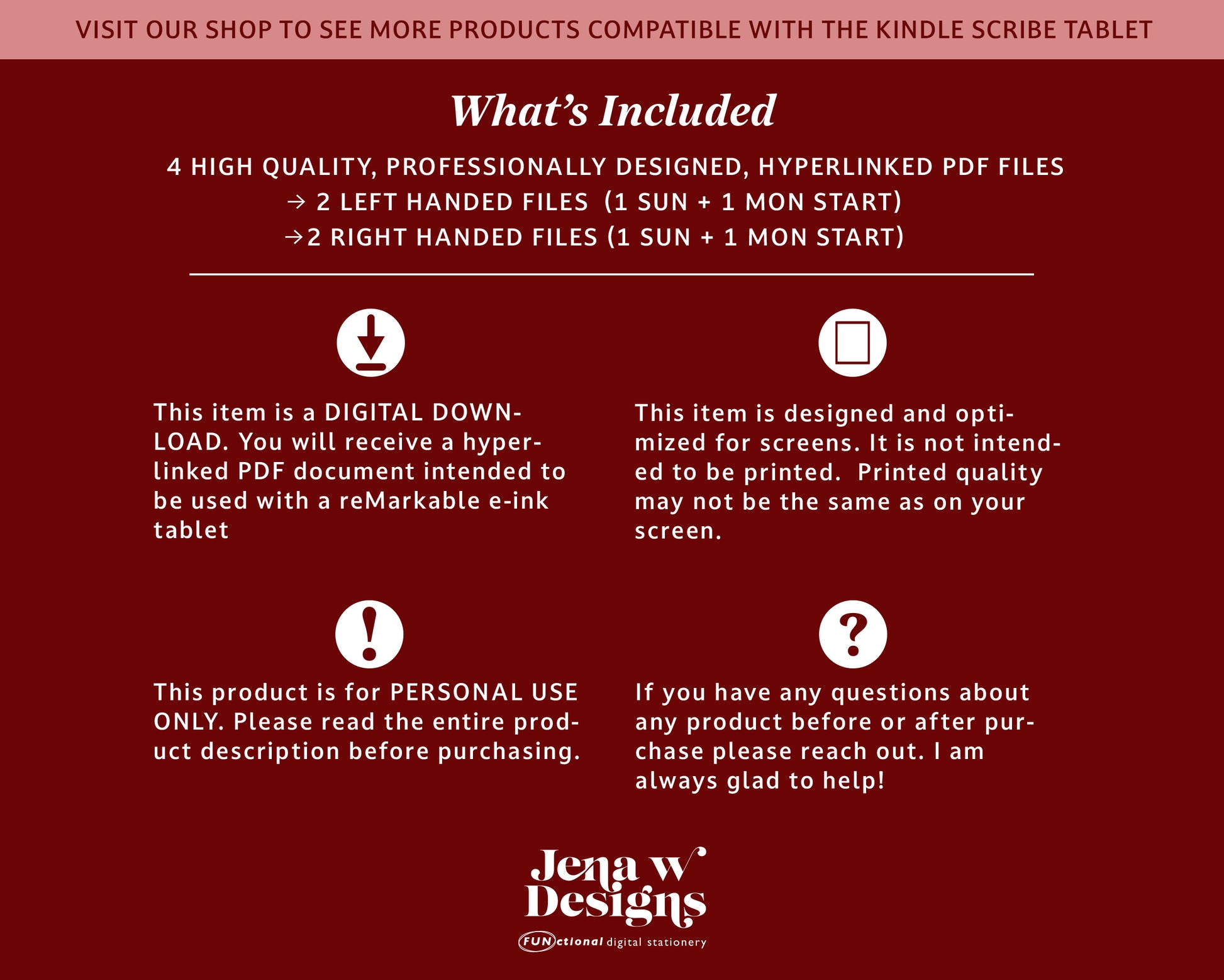 Plan your monthly, and weekly tasks with a simple and functional digital planner compatible with the Kindle Scribe e-ink tablet. A minimalist agenda with just the essentials to plan without overwhelm.