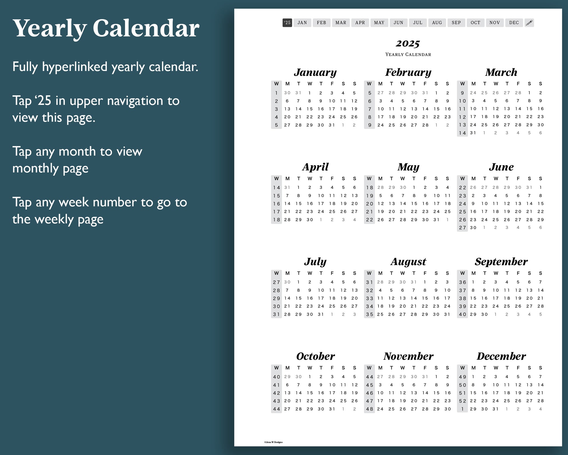 This high-quality pdf planner has a small file size of under 395 KB. Left and right-handed versions, Sunday and Monday start dates are all included.