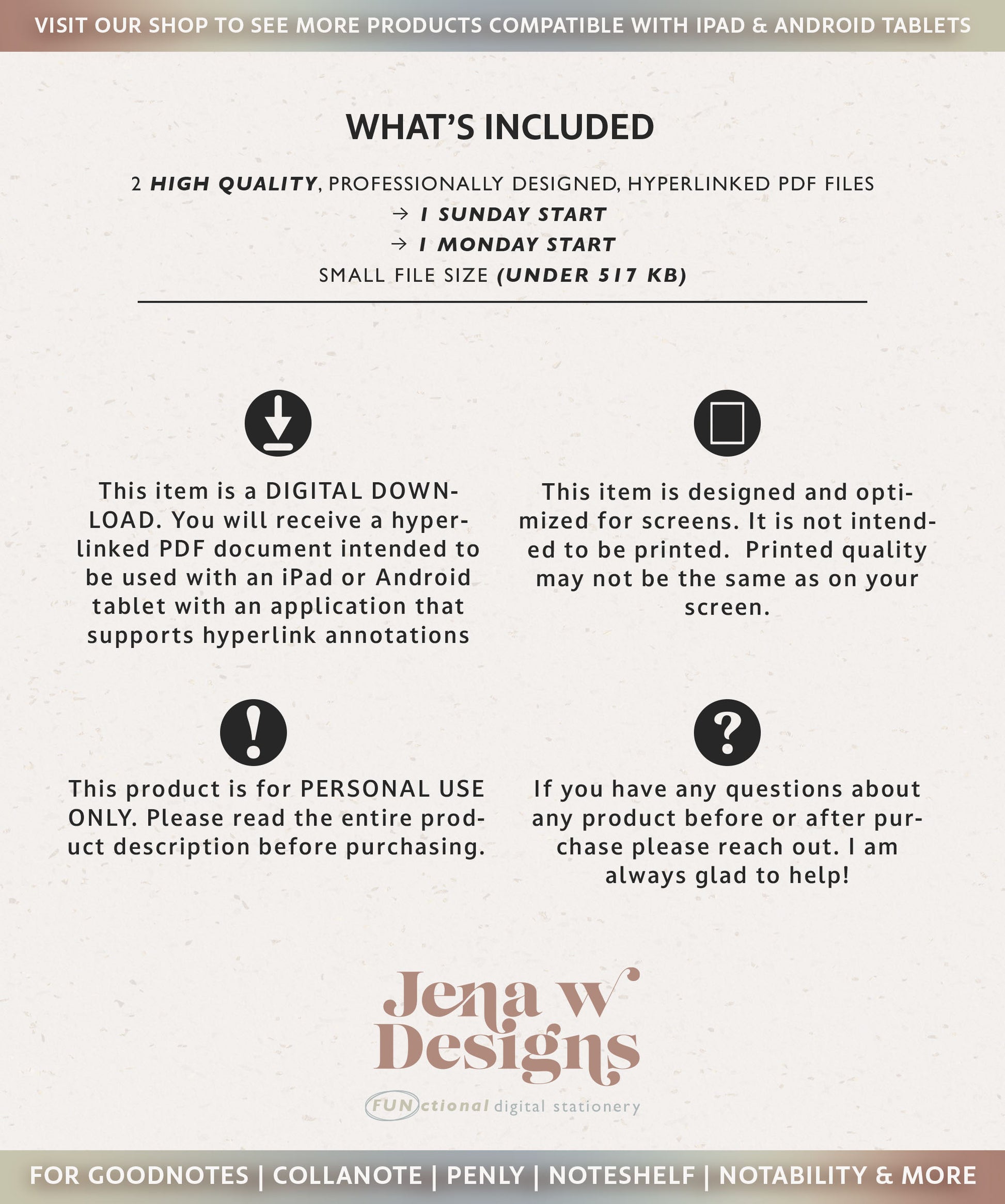 - 2 hyperlinked pdf files of your digital planner ( 1 Sunday and 1 Monday Start) to use in your preferred annotated hyperlink app such as GoodNotes. Review the compatibility tab if you would like to learn more about apps that work with digital pdf templates.