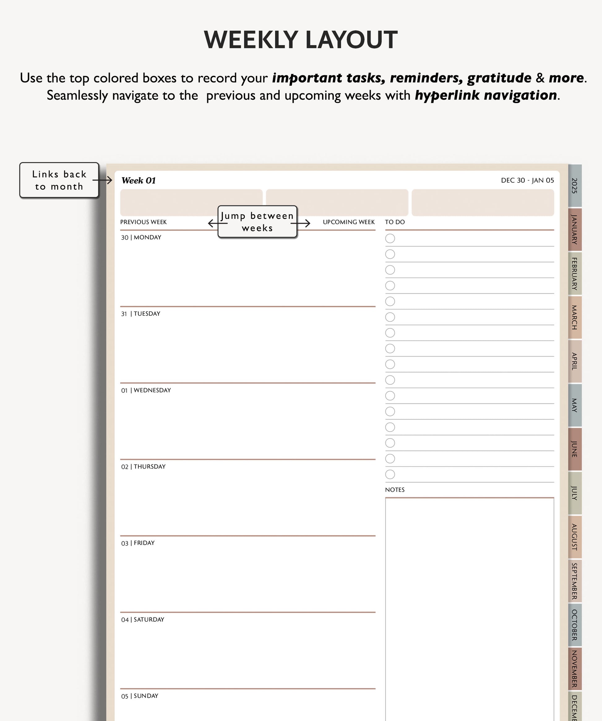 This paperless planner template is designed to be used with an annotated hyperlinks app such as GoodNotes.