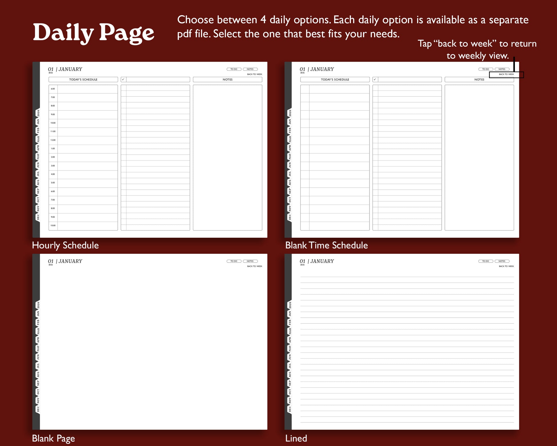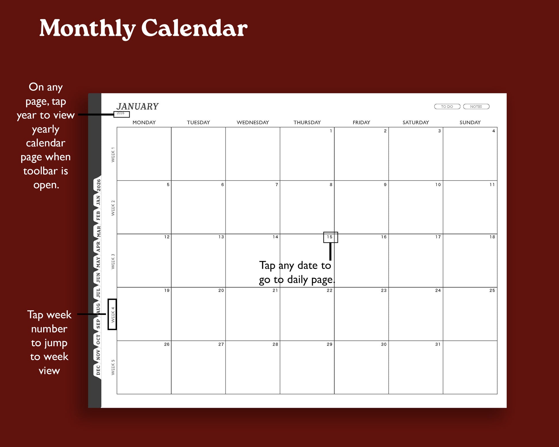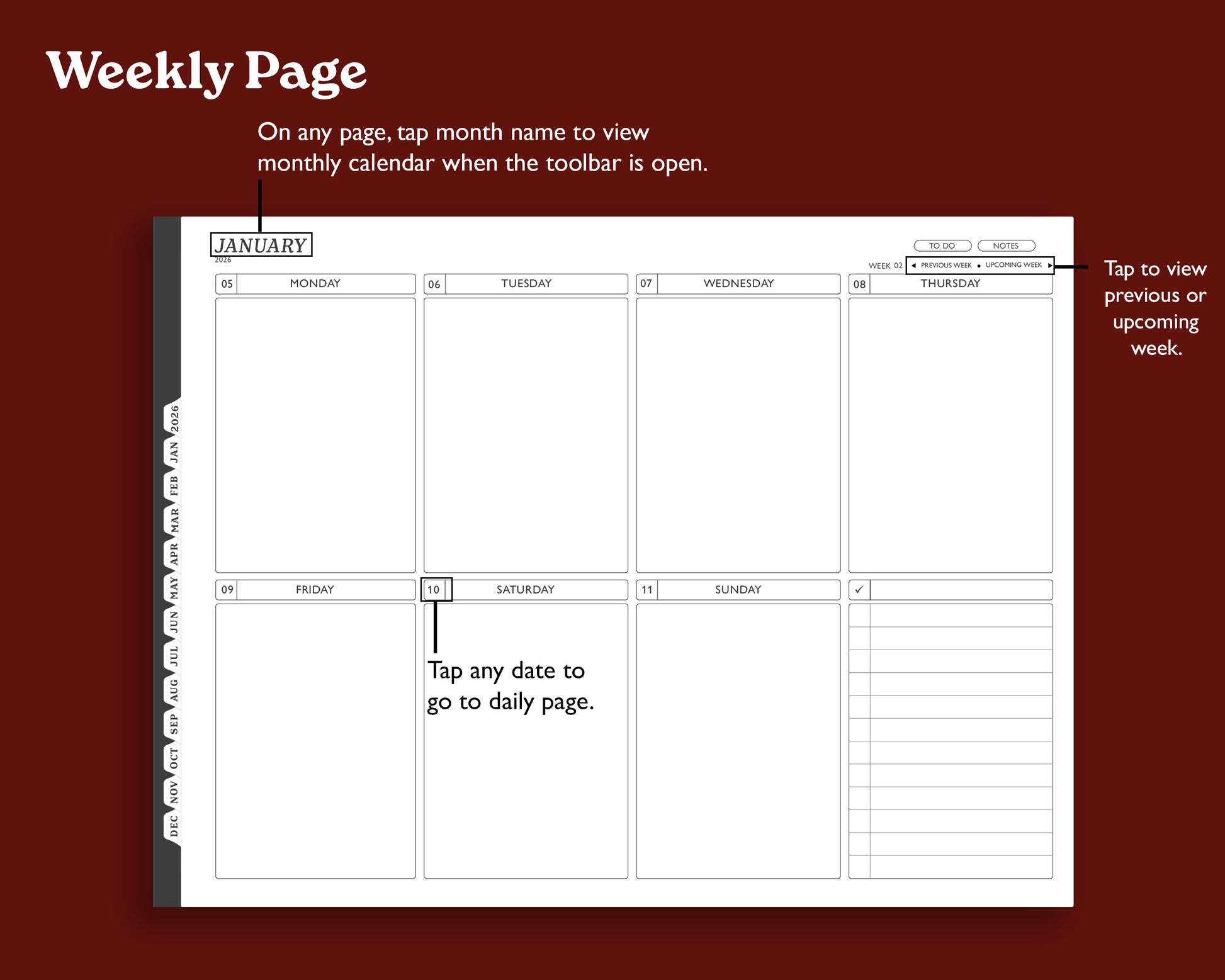 Keep track of your appointments, tasks, and thoughts with a simple and clean dated 2026 monthly, weekly, & daily calendar. This digital agenda is designed to use the maximum space on your tablet.