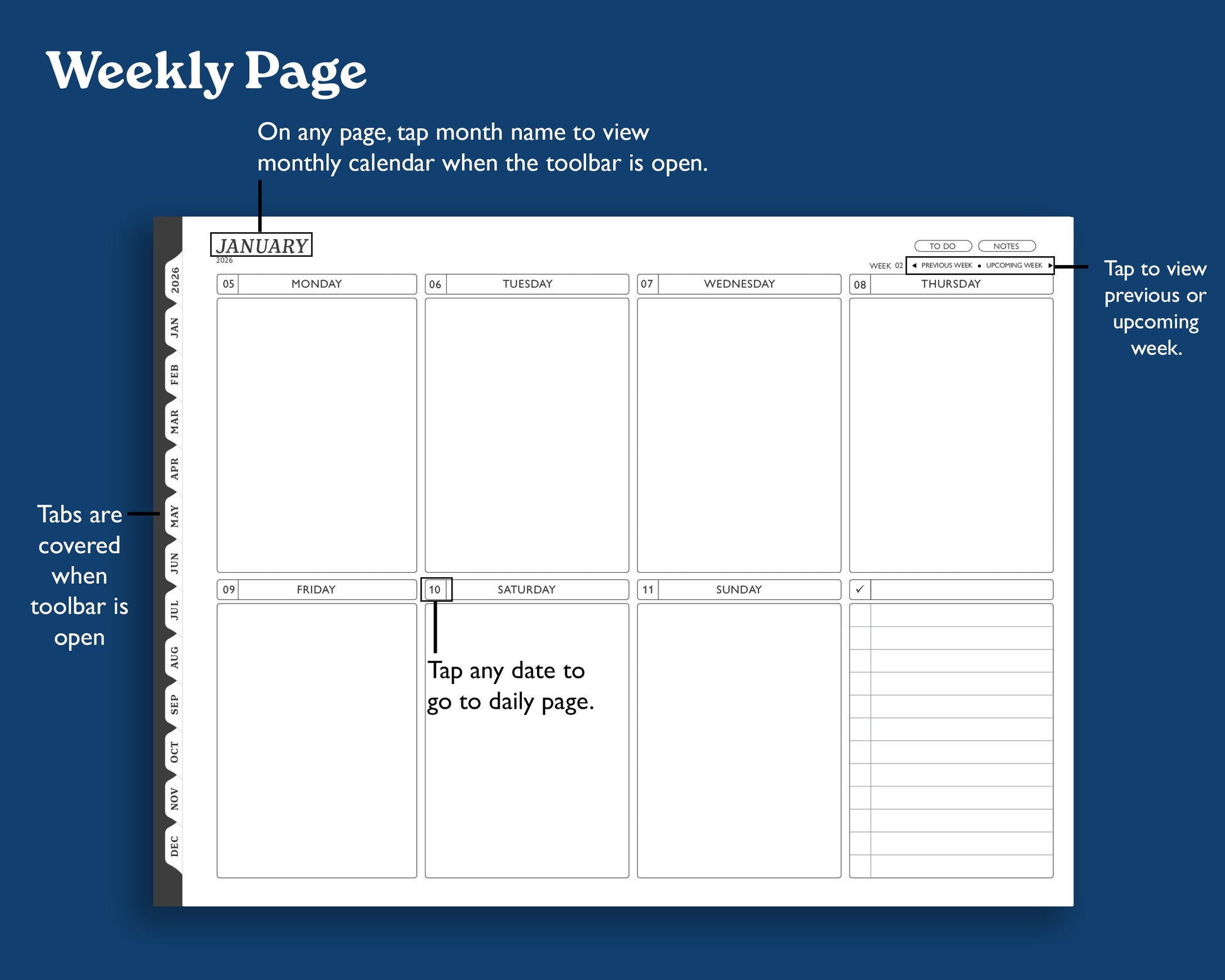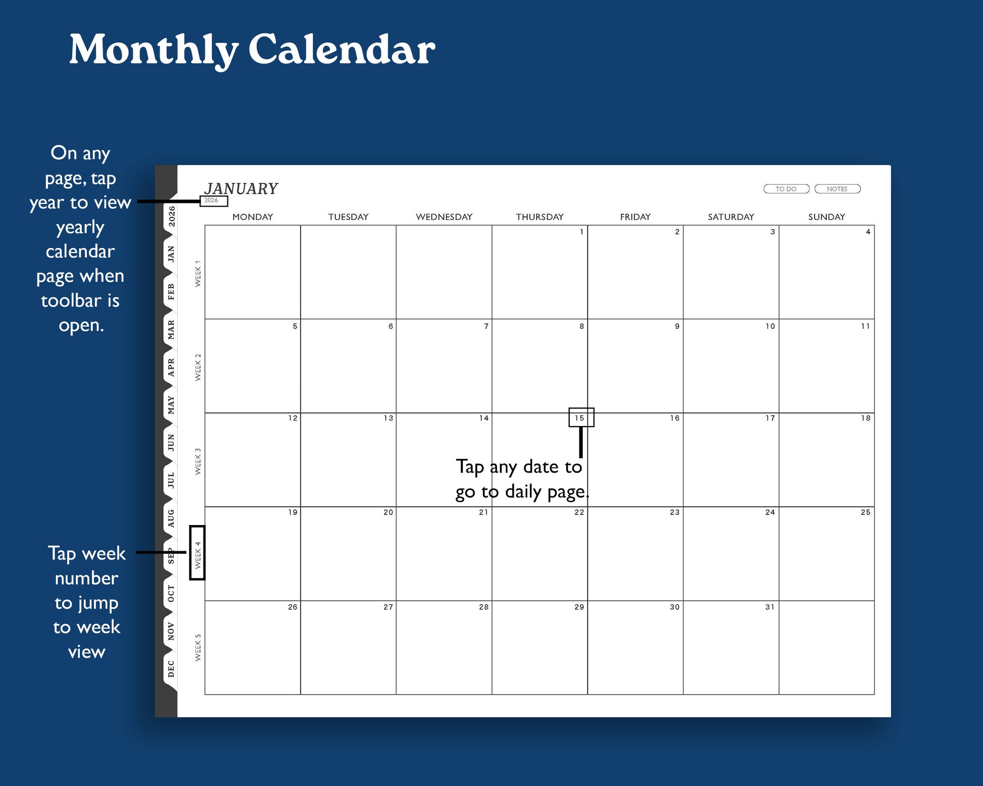 Keep track of your appointments, tasks, and thoughts with a simple and clean dated 2026 monthly and weekly calendar. This digital agenda is designed to use the maximum space on your tablet.