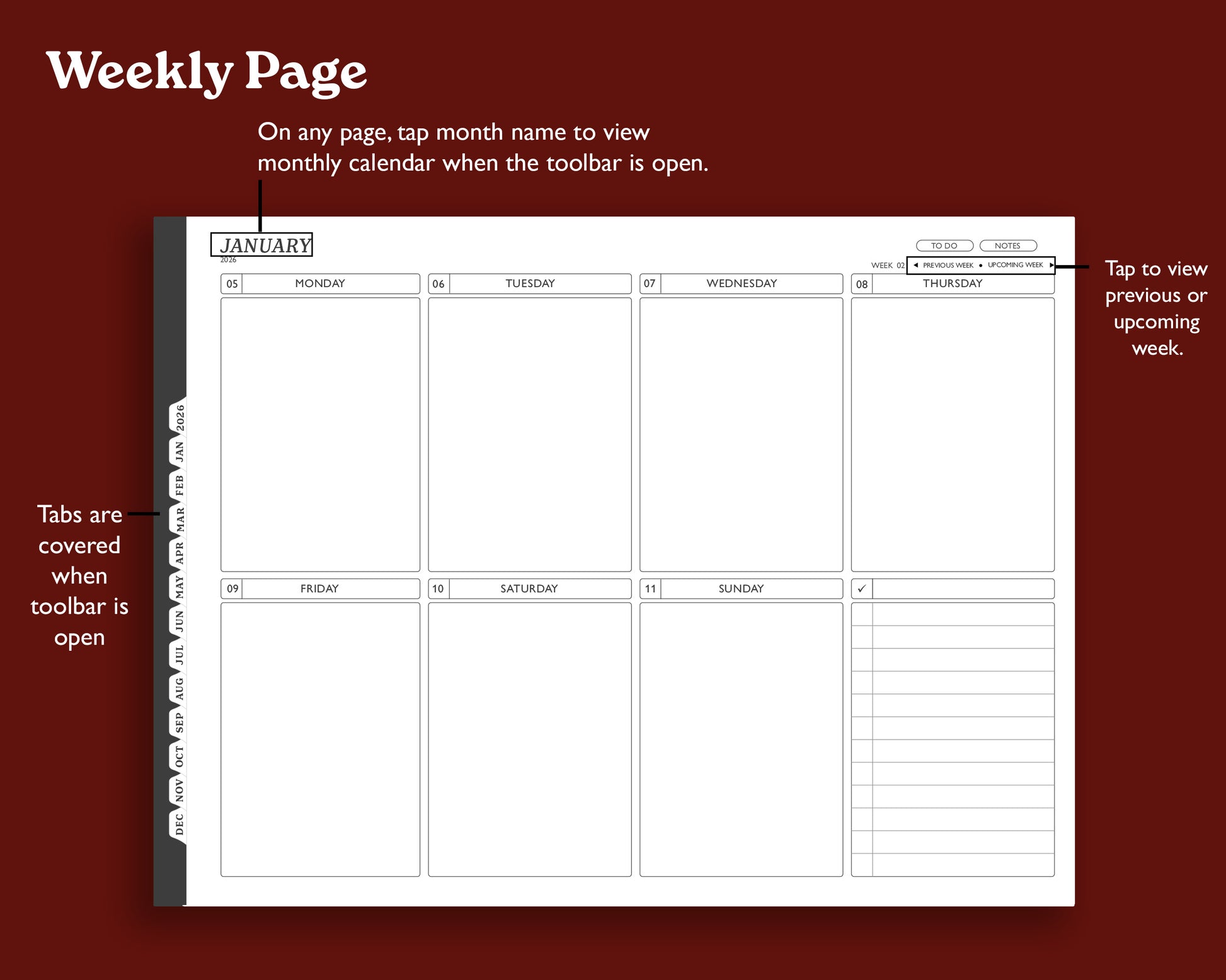 Keep track of your appointments, tasks, and thoughts with a simple and clean dated 2026 monthly and weekly calendar. This digital agenda is designed to use the maximum space on your tablet.