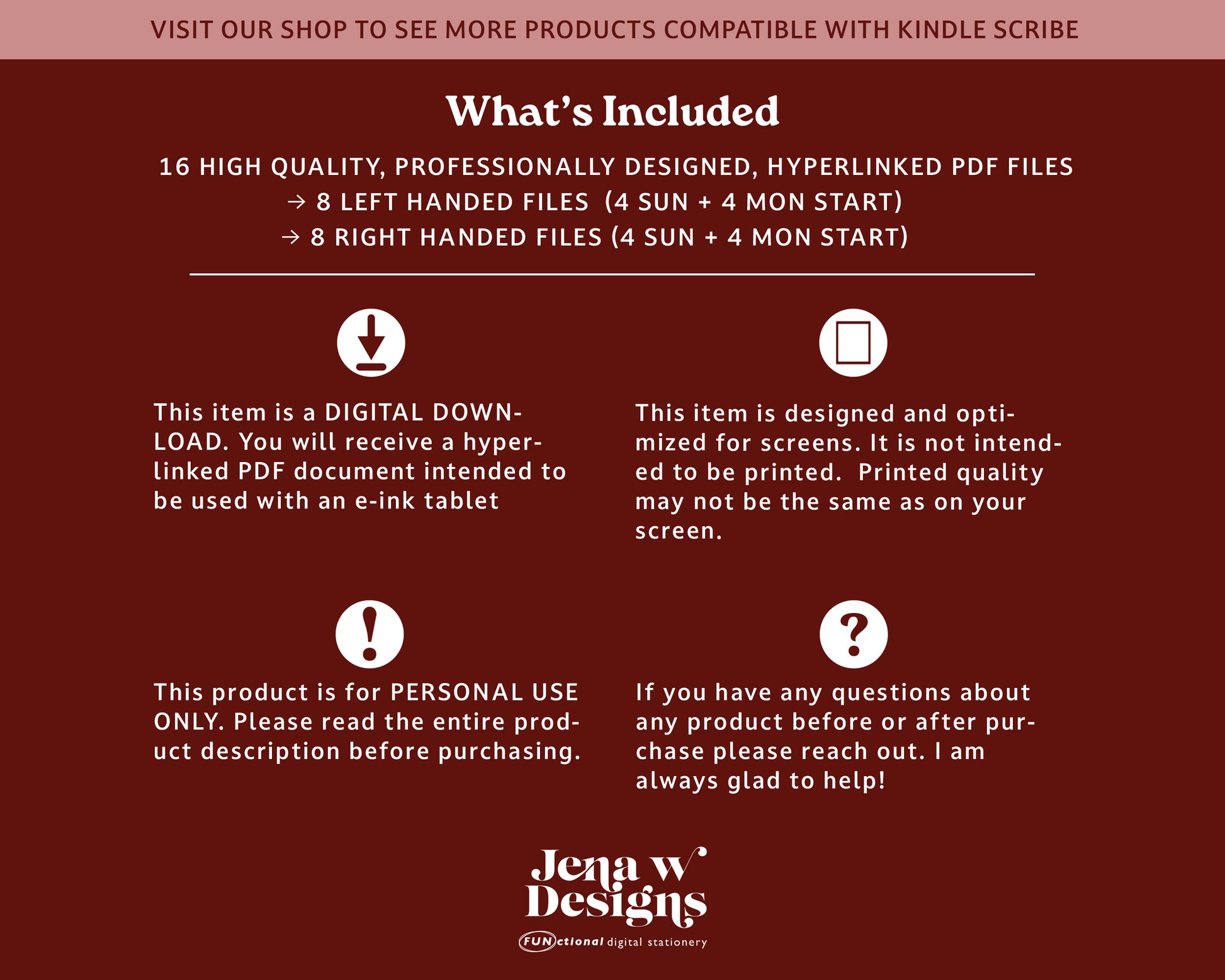 All e-ink products are designed and tested for Kindle Scribe tablets. They may fit and work with other e-ink screens, however the document is designed with the Kindle Scribe toolbar in mind.