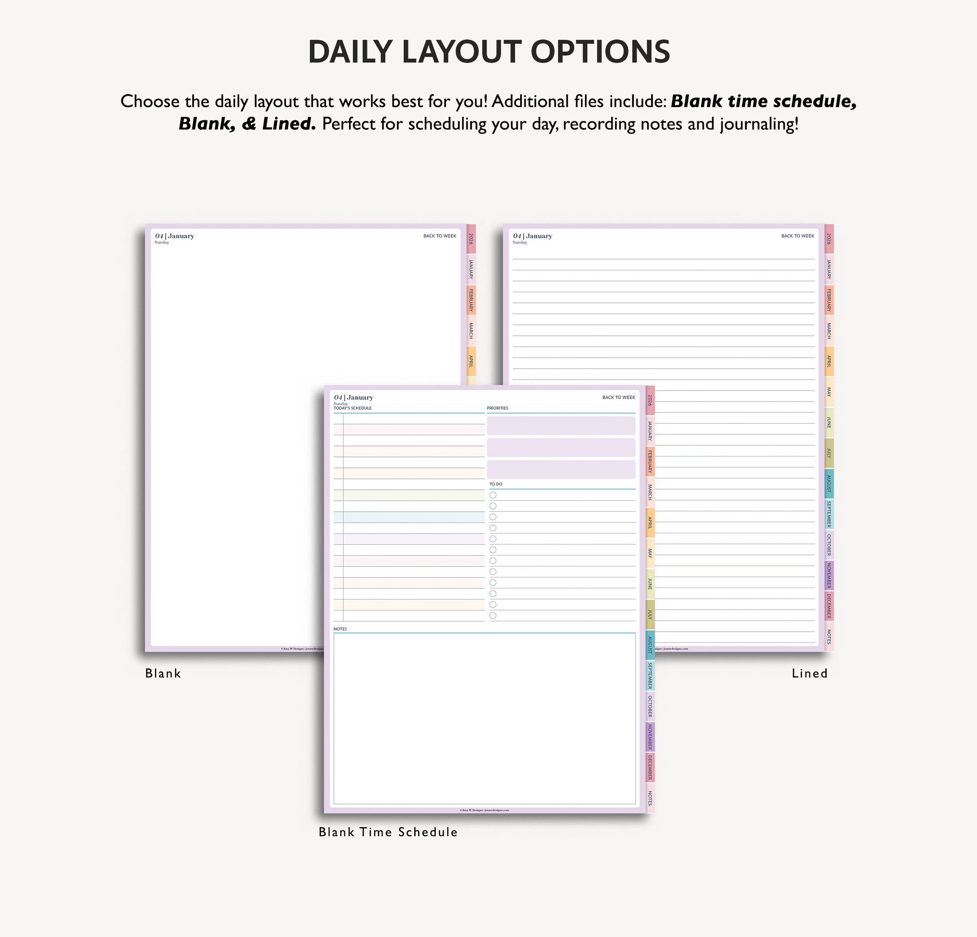 - daily layouts to choose from (hourly, blank hourlyy, lined, blank, creating flexible options)