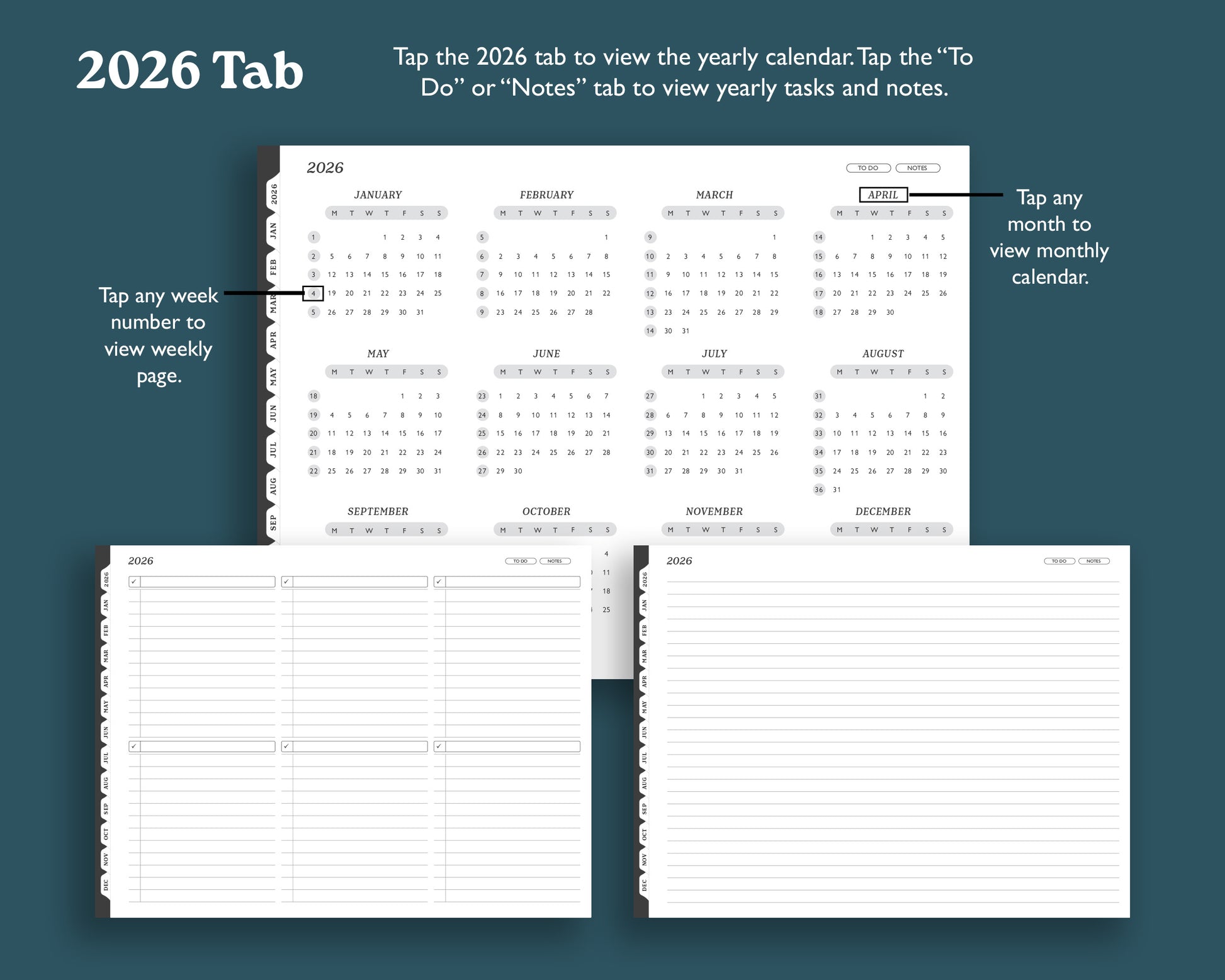 Keep track of your appointments, tasks, and thoughts with a simple and clean dated 2026 monthly and weekly calendar. This digital agenda is designed to use the maximum space on your tablet.