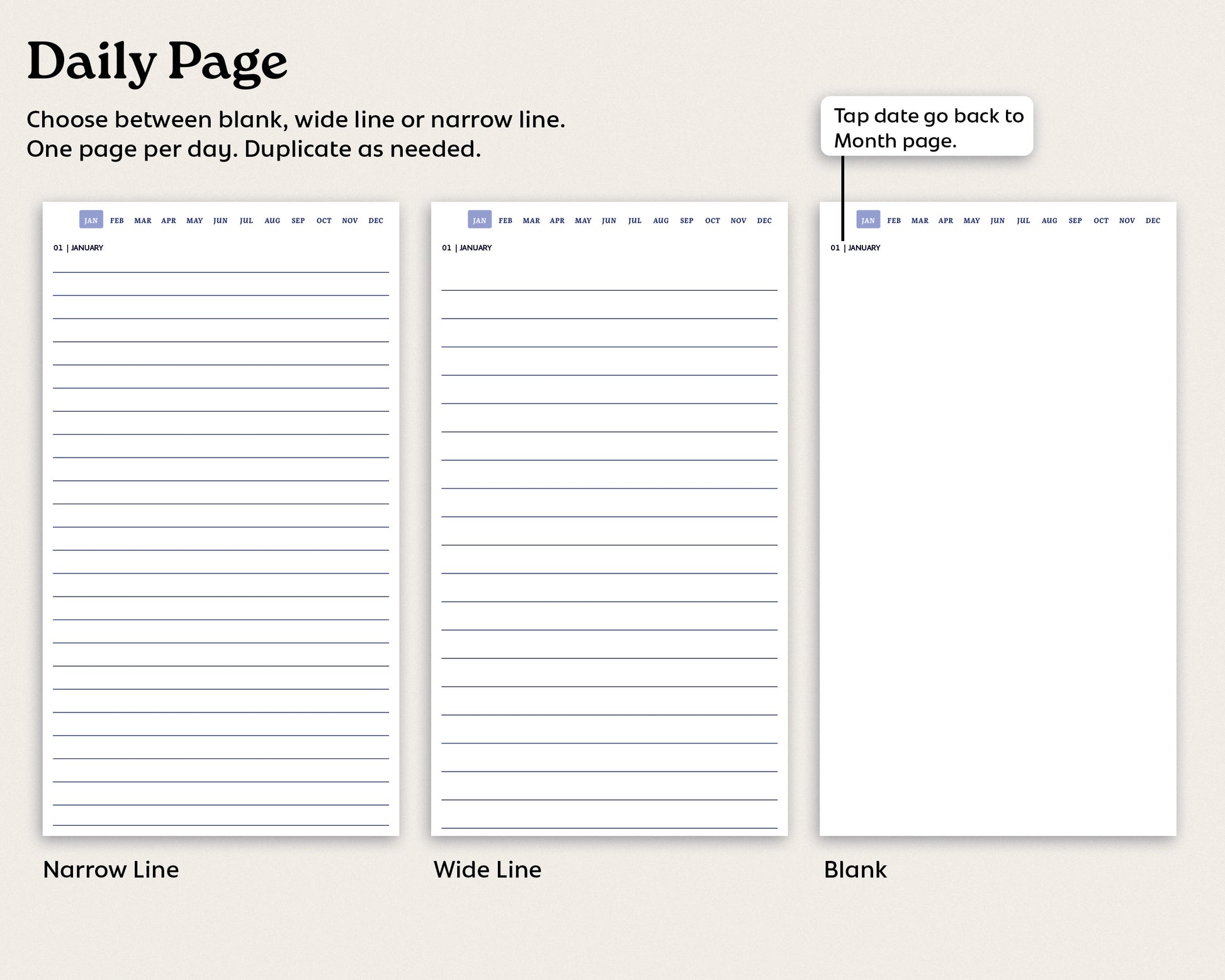 - Daily Layout Options – Narrow Lined, Wide Lined, and Blank page styles included