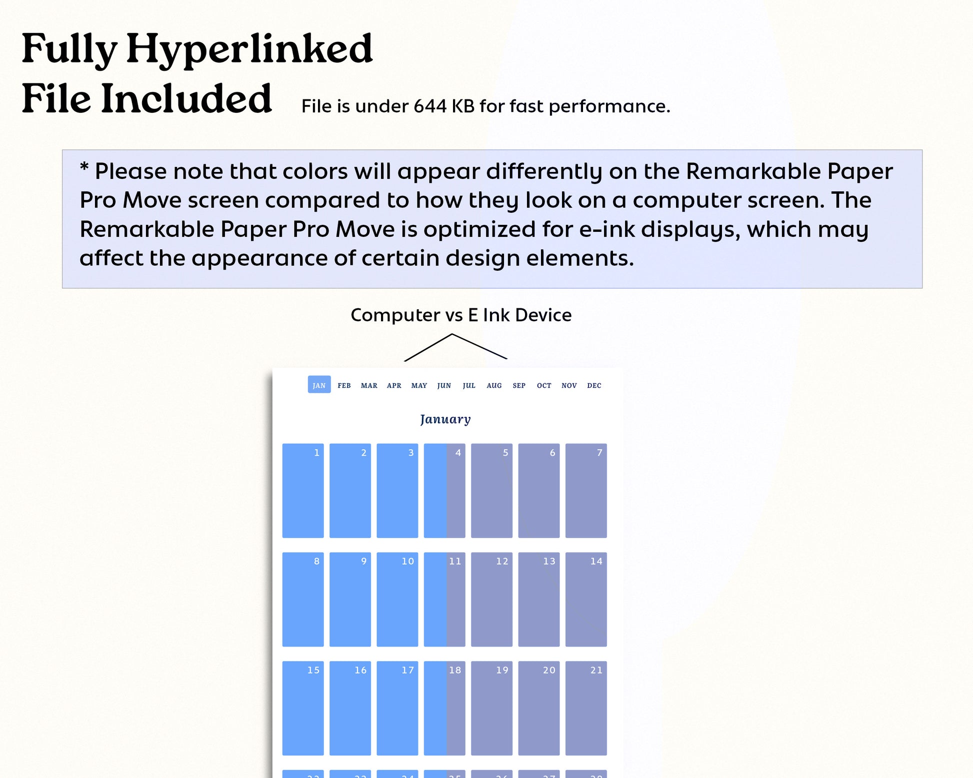 All e-ink products are designed and tested for use with the reMarkable Paper Pro Move tablets. They may fit and work with other e-ink screens, however the document is designed with the reMarkable toolbar in mind.