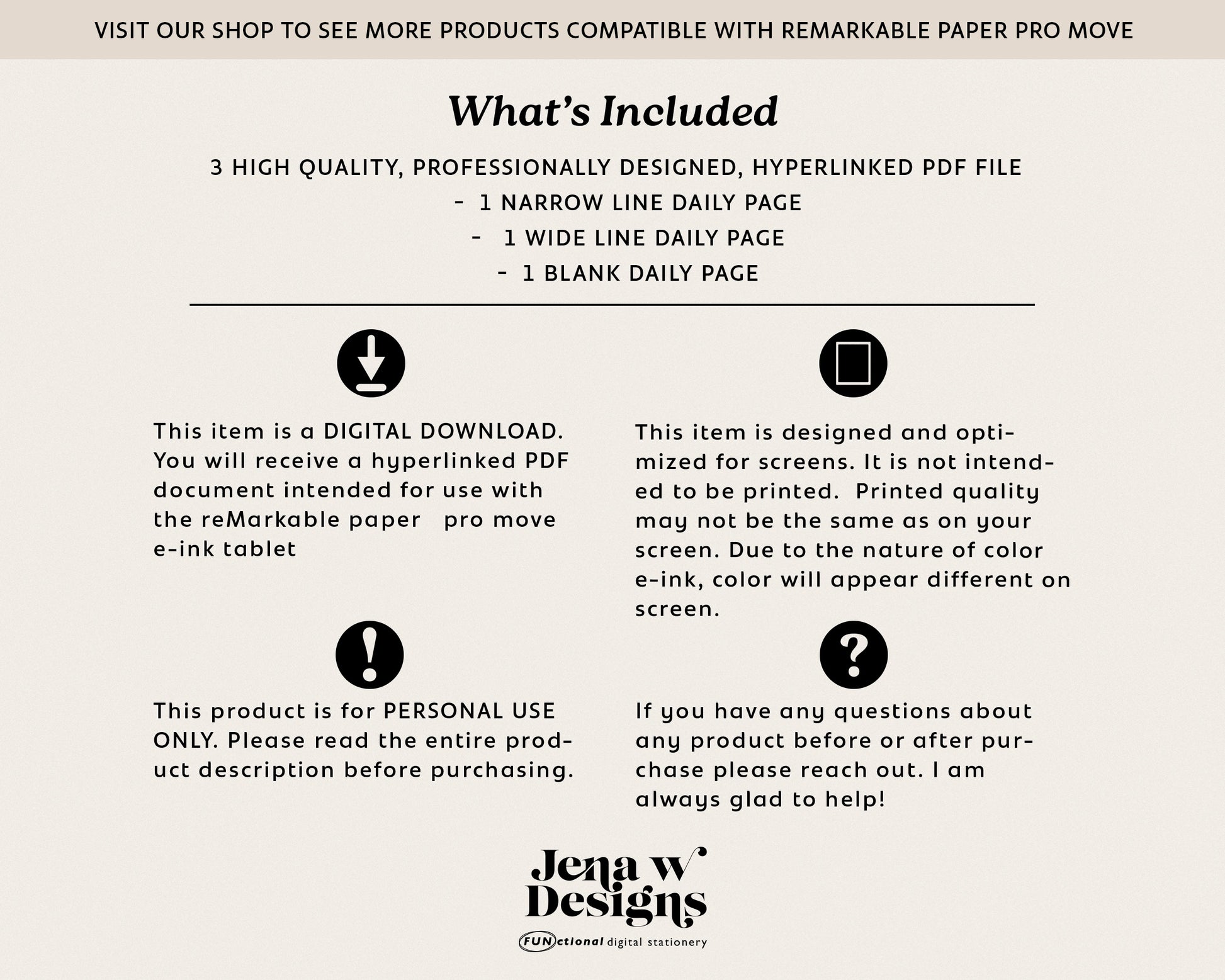 Stay consistent with your journaling all year long using this 365 Daily Journal designed for the reMarkable Paper Pro Move. With fast navigation, simple layouts, and minimal design, this lightweight digital journal makes it easy to capture your thoughts, track habits, or reflect daily.