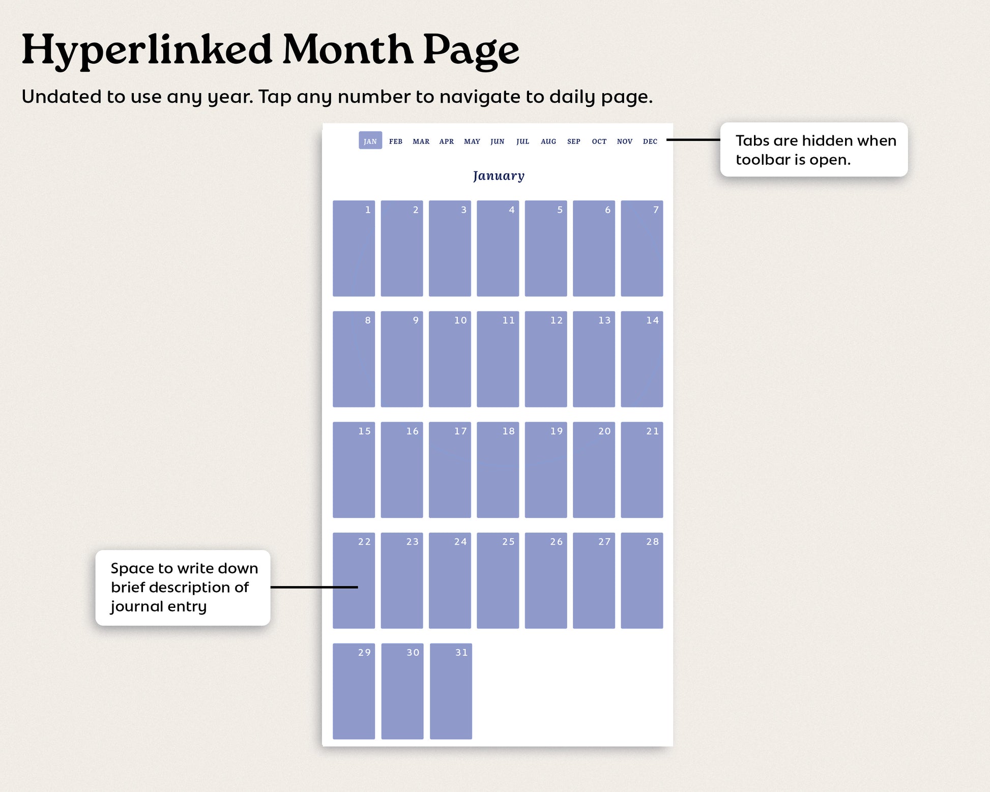 Use the monthly pages as an index for your daily journaling—perfect for recording a summary, habit, or quick note. Tap the date to jump to the linked daily page, and duplicate any page if you need more space.