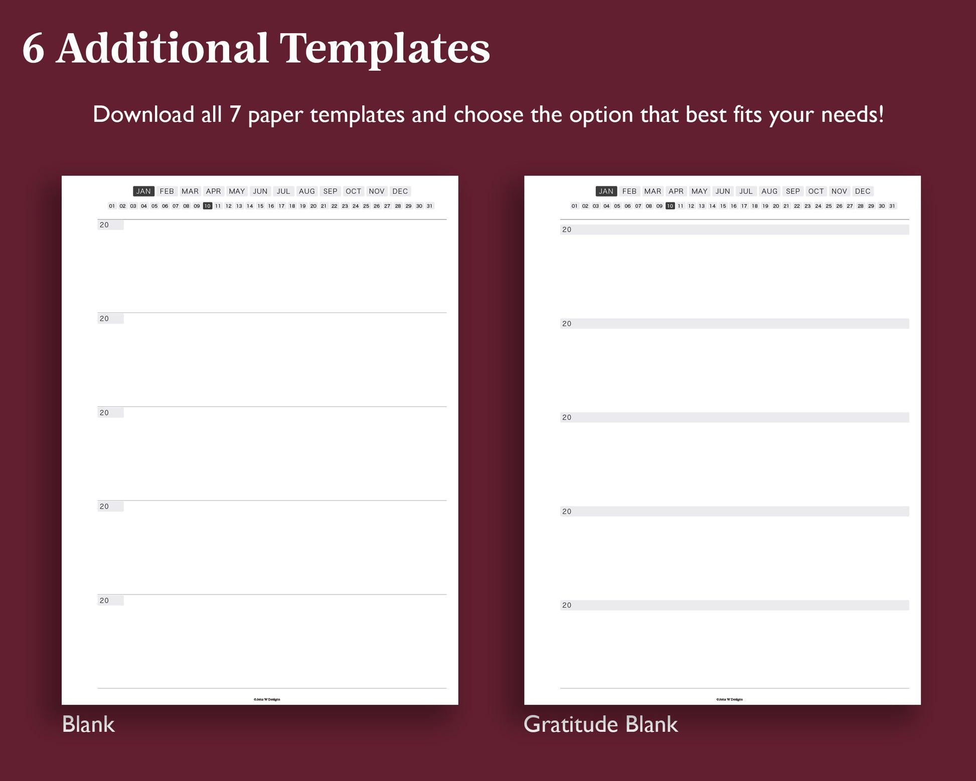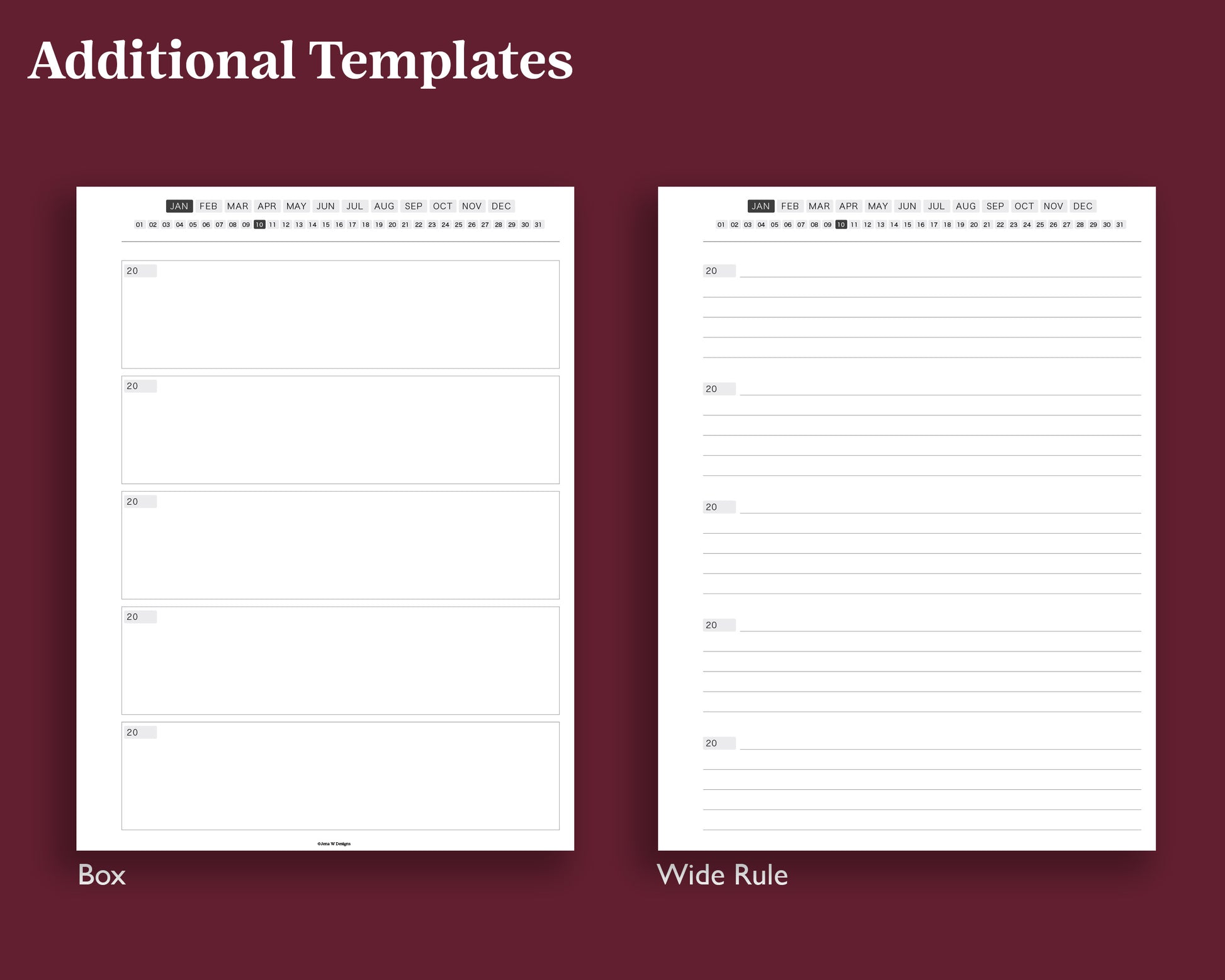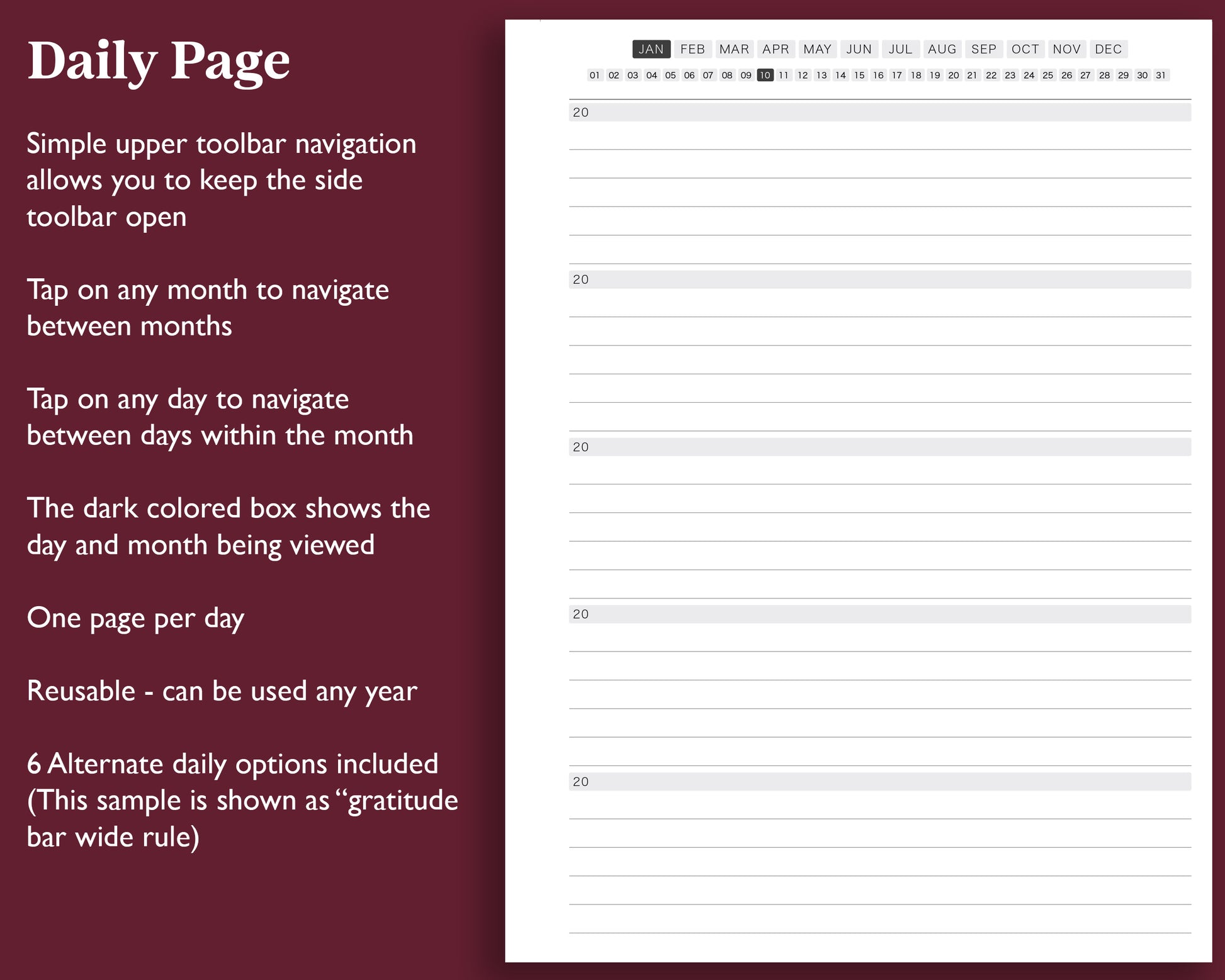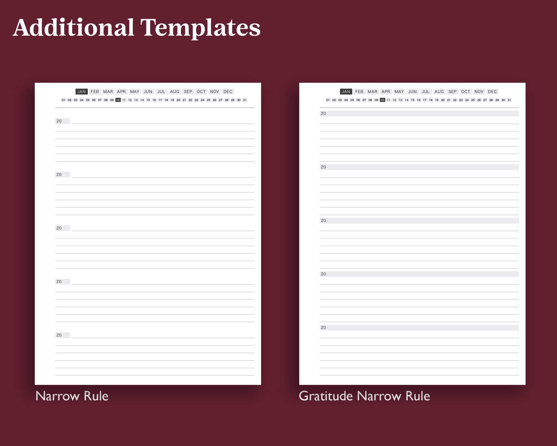 - 7 daily options to choose: variations include narrow rule, wide rule, boxed and blank and with space for daily gratitude.