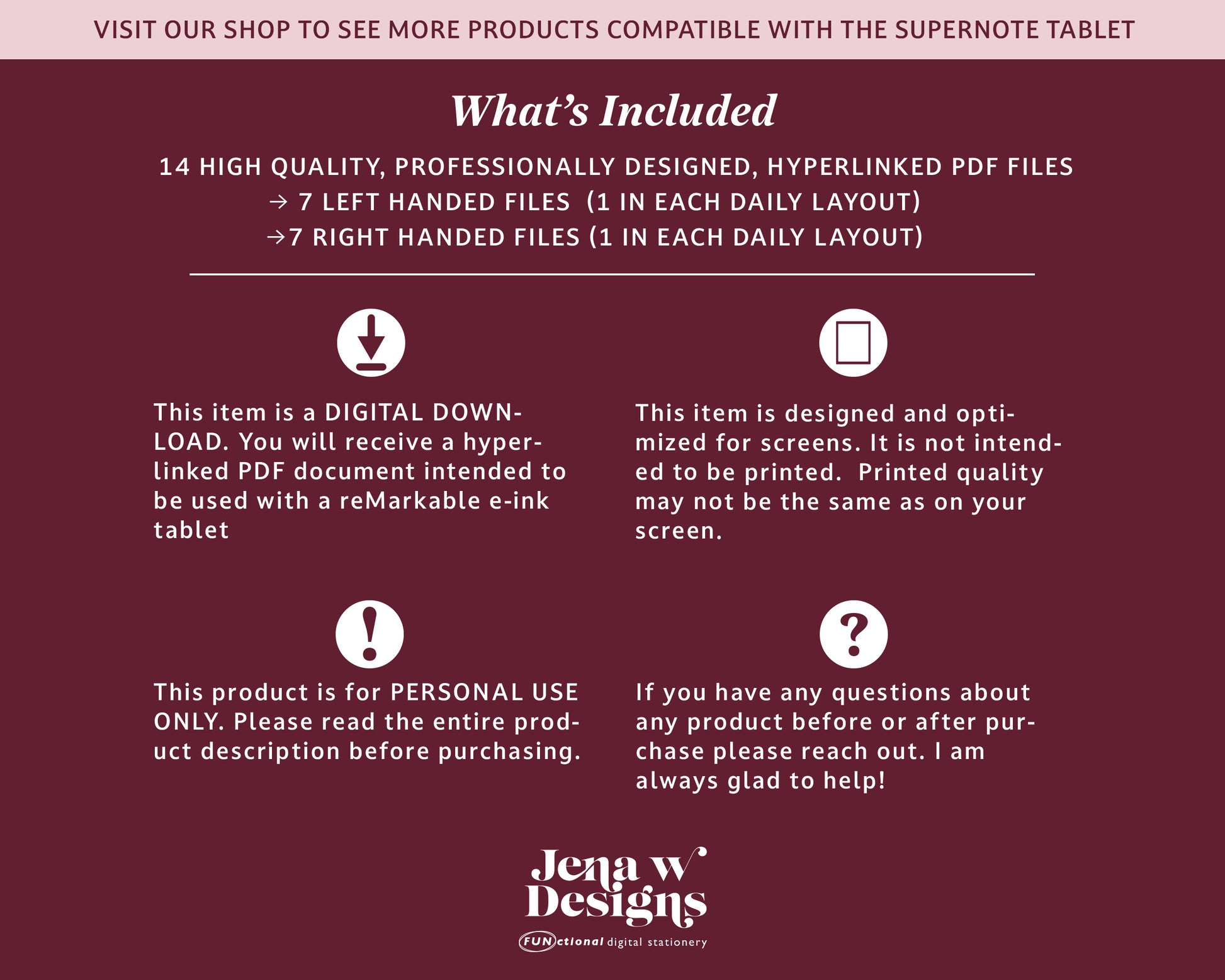 This pdf planner is designed and optimized for use with the Supernote e-ink tablet.