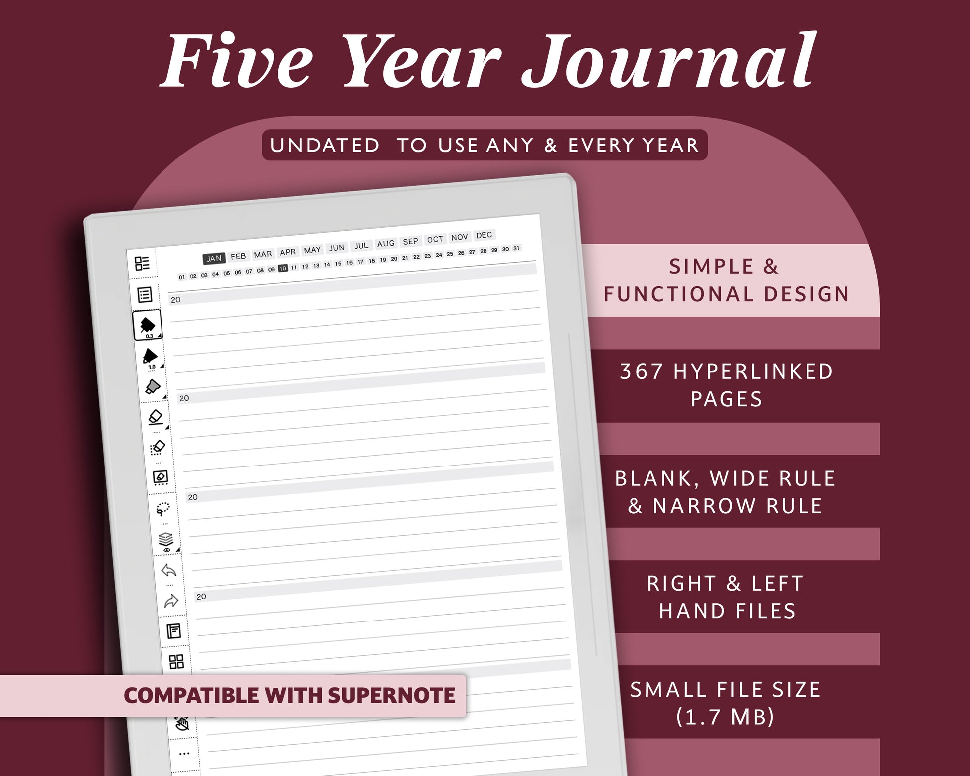 Daily journal, practice gratitude, and more with this fully hyperlinked and reusable five year daily journal compatible with the supernote e ink tablet.