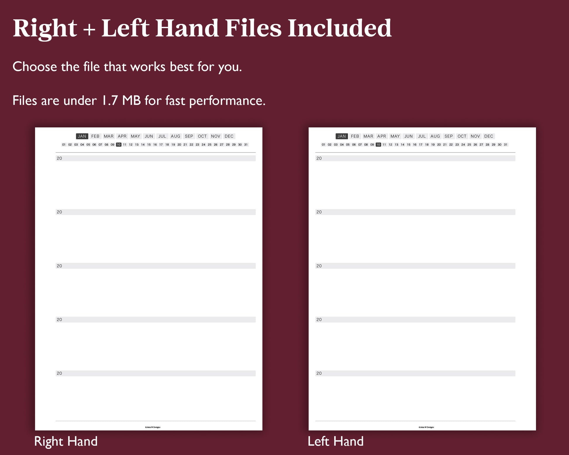 This high-quality pdf planner has a small file size of under 1.7 MB. Left and right-handed versions are included.