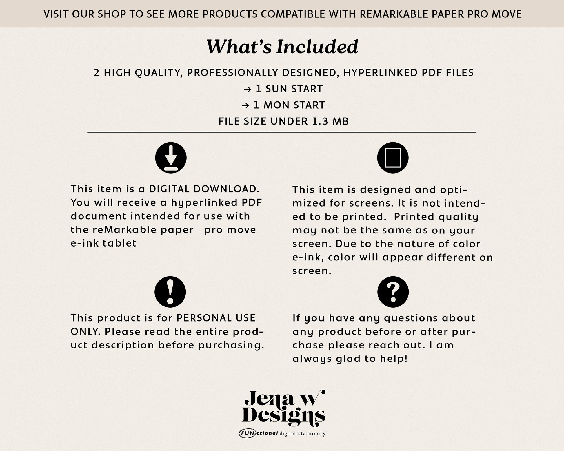 - 2 professionally designed & optimized pdf files (1 Sun & 1 Mon start)