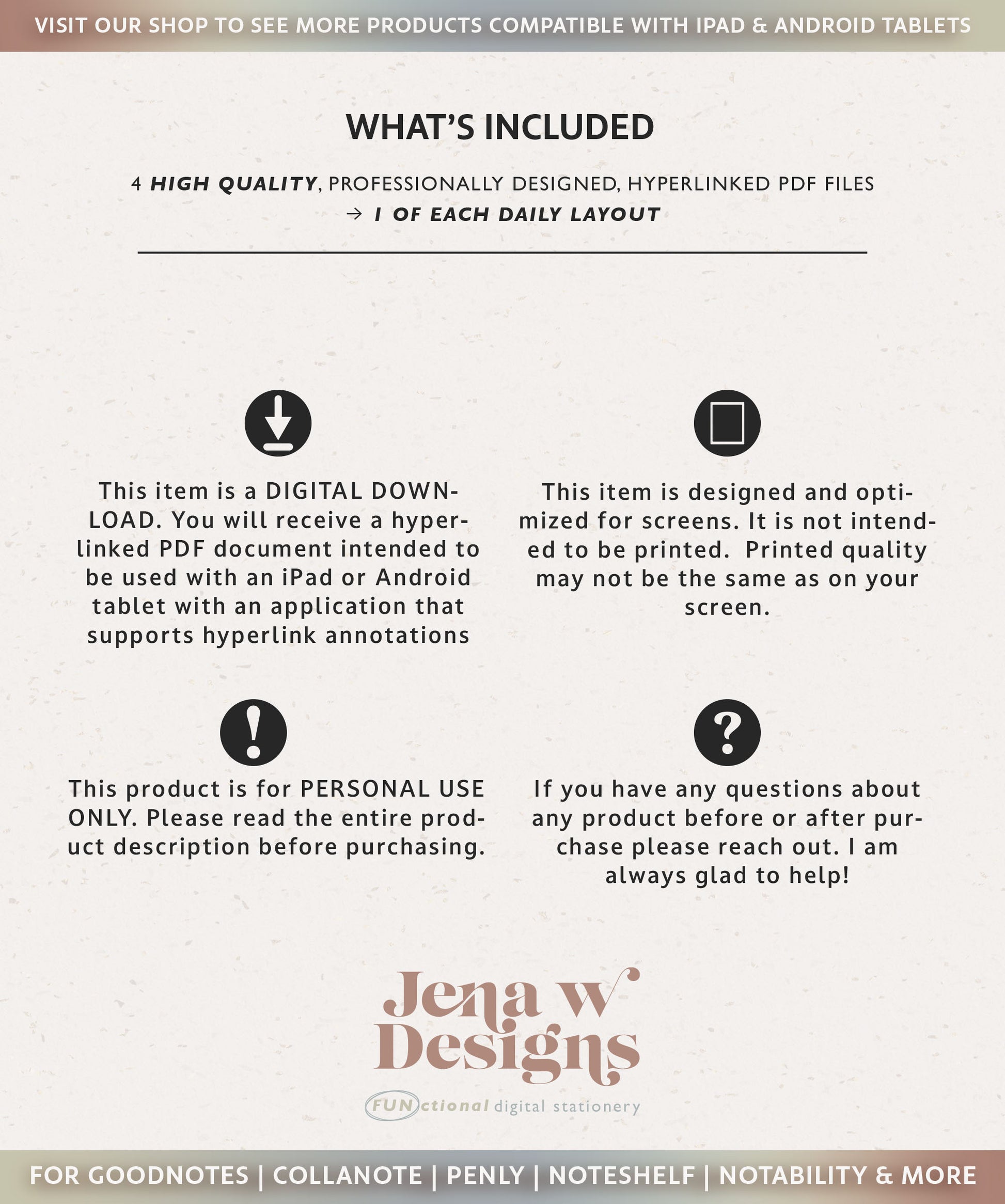 - 4 daily layouts to choose-simply select the pdf file that fits your needs after purchase