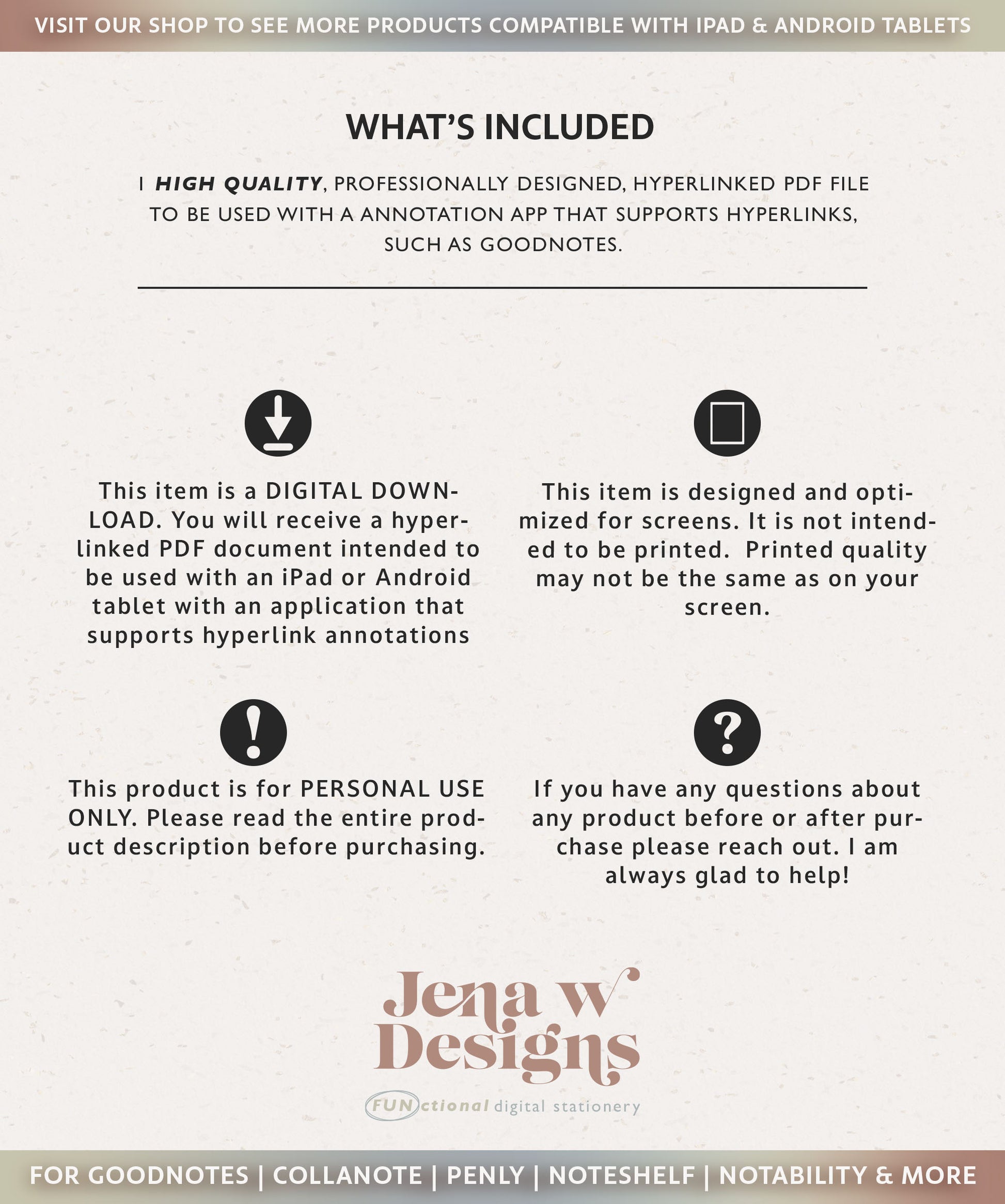 - One hyperlinked pdf file to use in your preferred annotated hyperlink app, such as GoodNotes. Review the compatibility tab if you would like to learn more about apps that work with digital pdf templates.