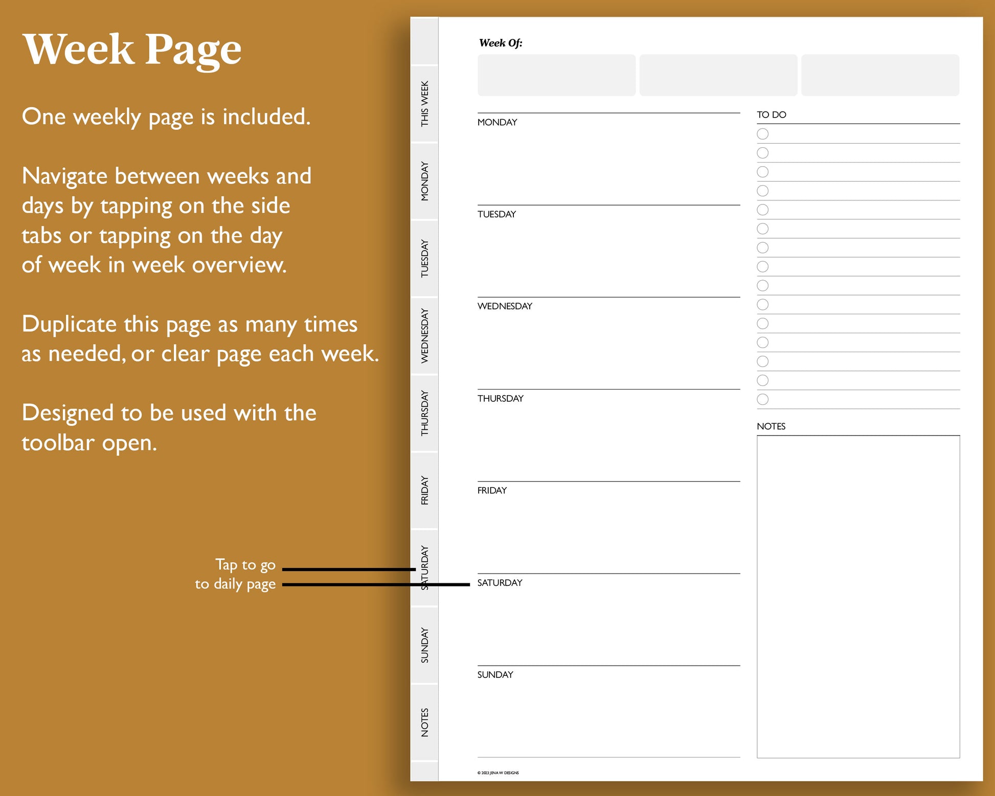 Test out digital planning on your reMarkable tablet with a free one week daily planner. This hyperlinked pdf template is designed to fit your reMarkable tablet. It includes one weekly overview page, seven daily pages with a blank time schedule and 5 note paper templates. The perfect planner to test the quality of Jena W Designs products and see how a hyperlinked document works on your e-ink device.