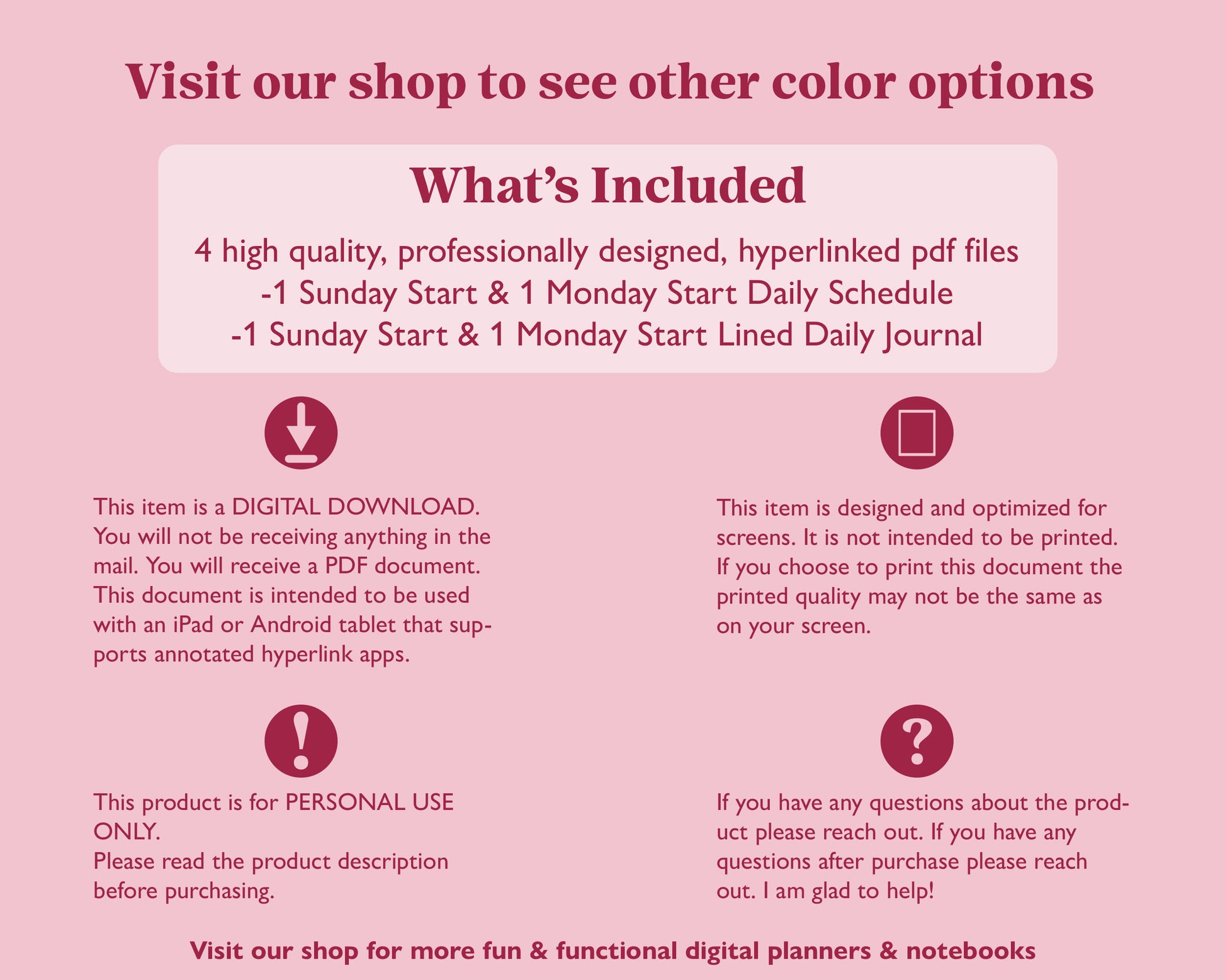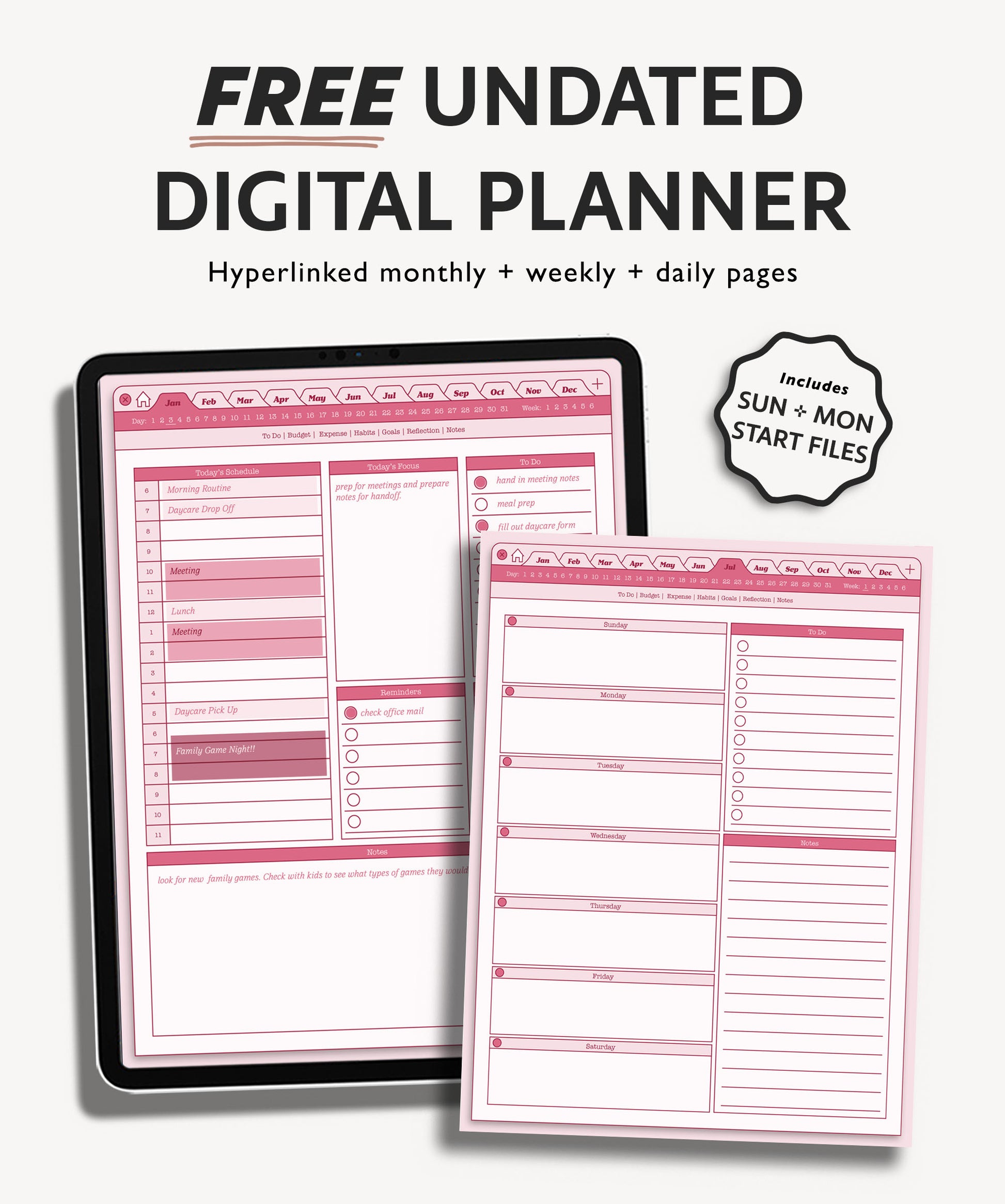 • 4 hyperlinked pdfs (1 Sunday Start daily schedule & 1 Monday Start daily schedule, 1 Sunday Start daily journal & 1 Monday Start daily journal) to use in your preferred annotated hyperlink app such as GoodNotes. Review the compatibility tab if you would like to learn more about apps that work with digital pdf templates.