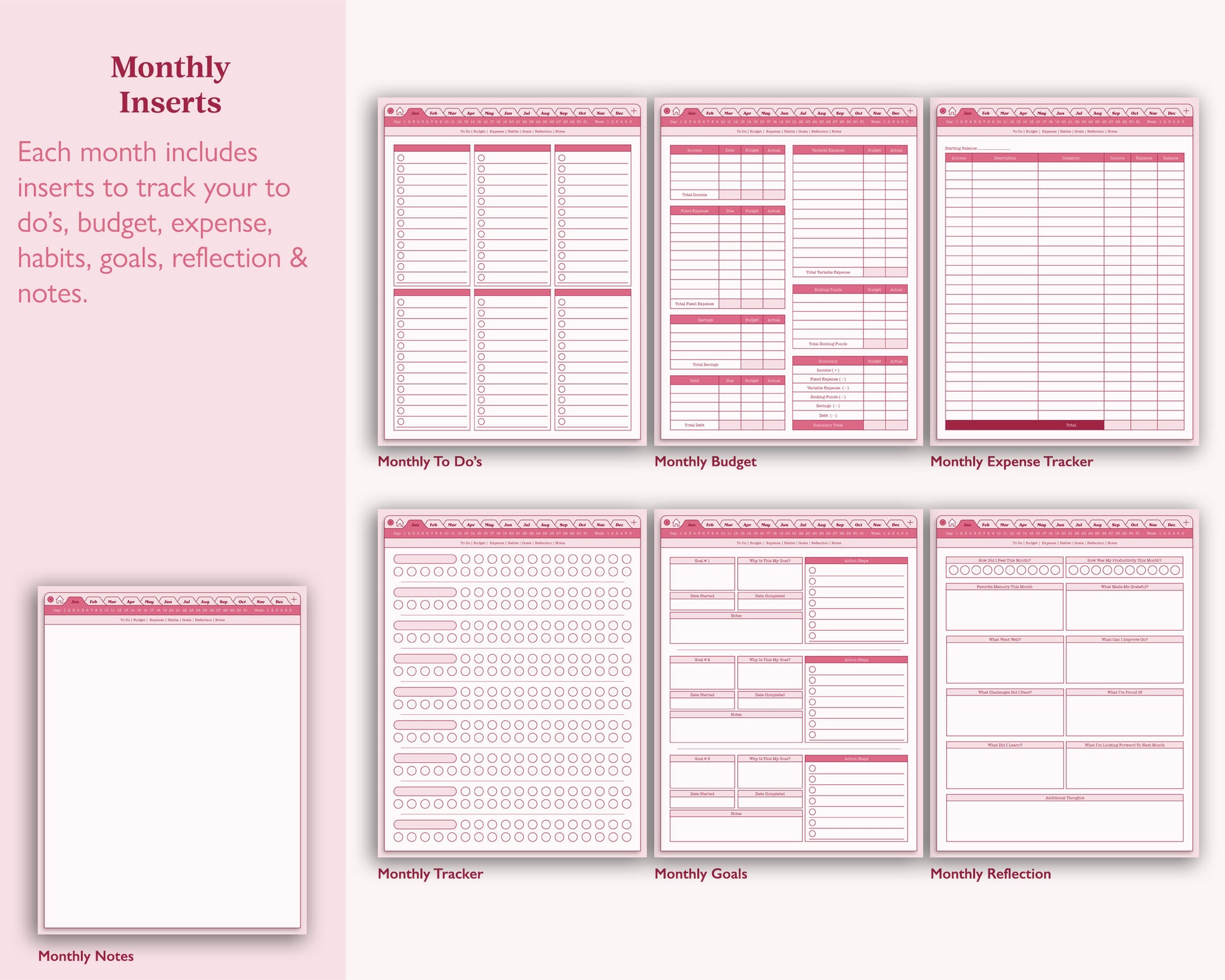 • Monthly inserts include: to-do's, budget tracker, expense tracker, habit tracker, goal tracker, reflection and notes