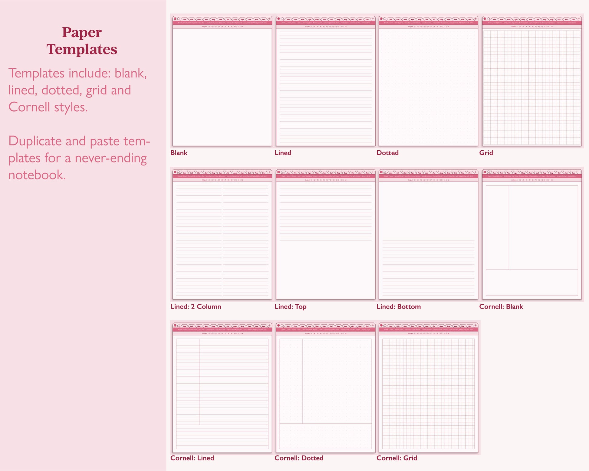 • 11 paper templates including blank, lined, dotted, grid & Cornell styles