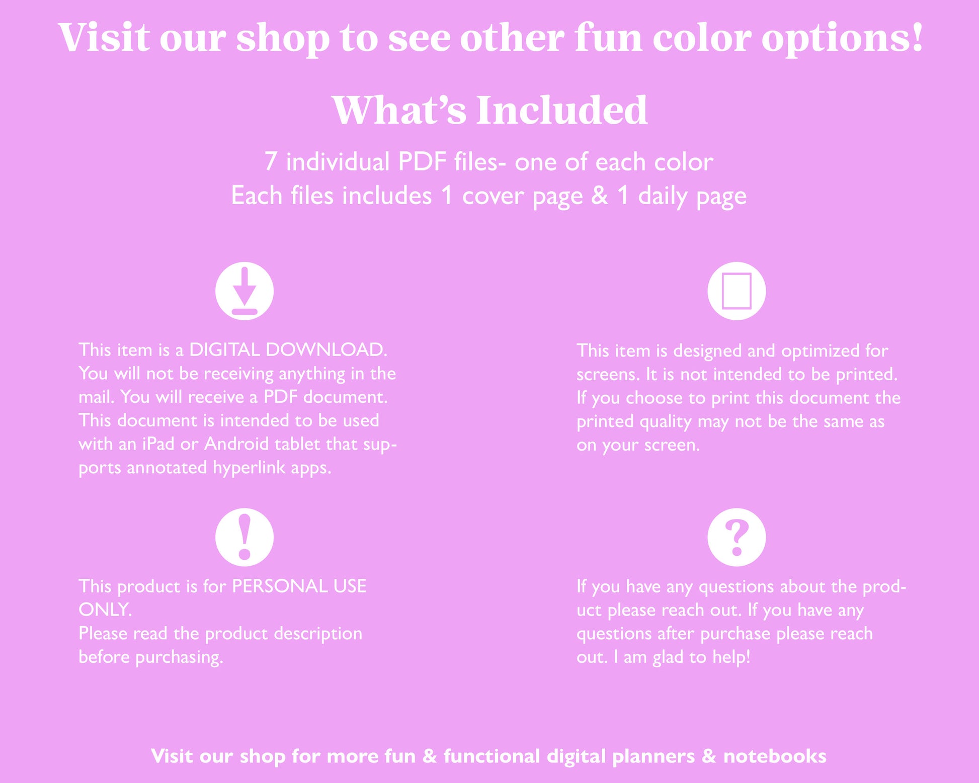 Keep things simple with a fun, bright pastel, daily planner page. This daily page is designed to be duplicated each day (or cleared) making it really easy to use-no hyperlinks or extra pages!