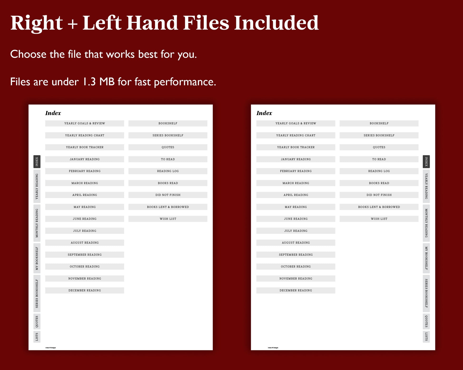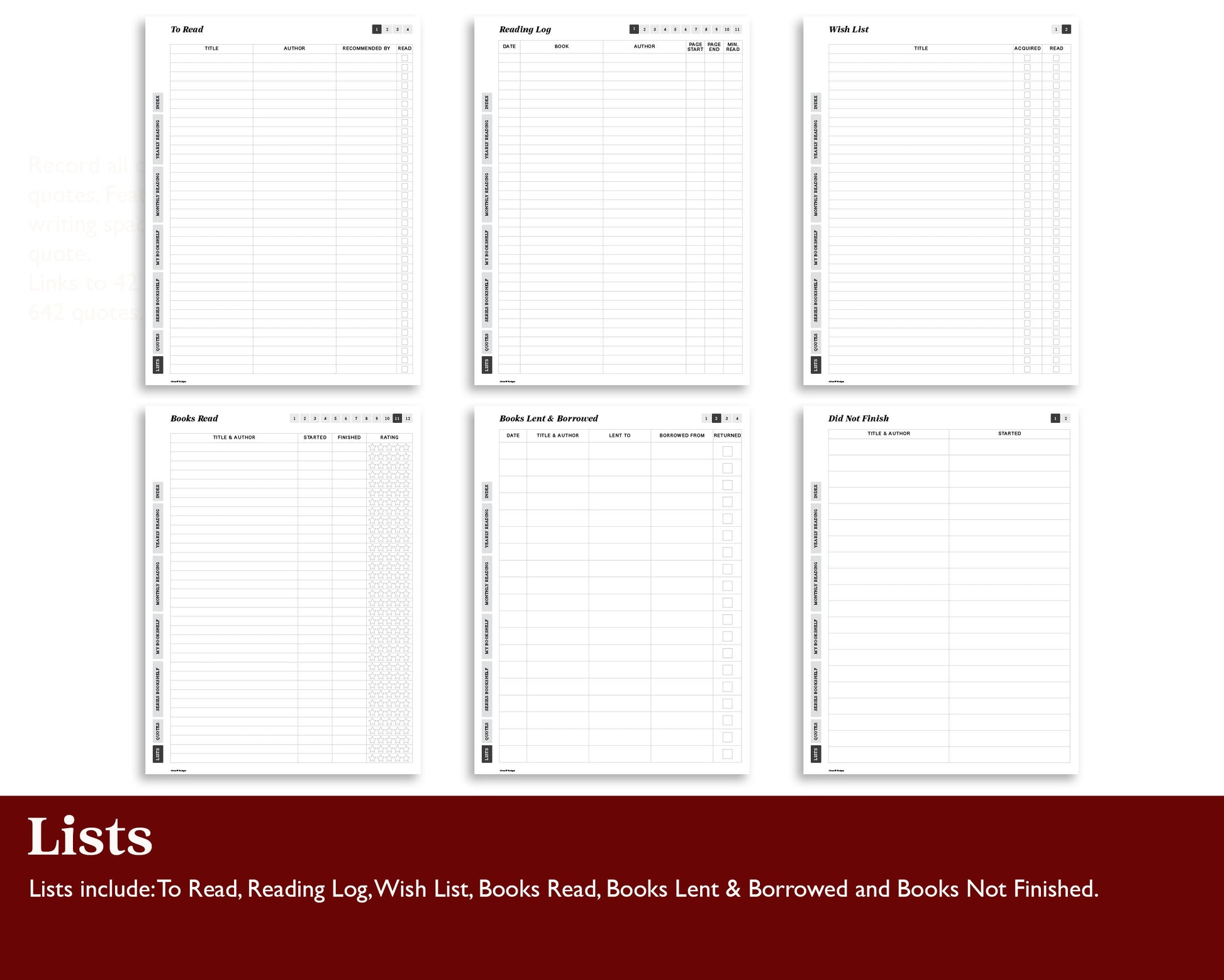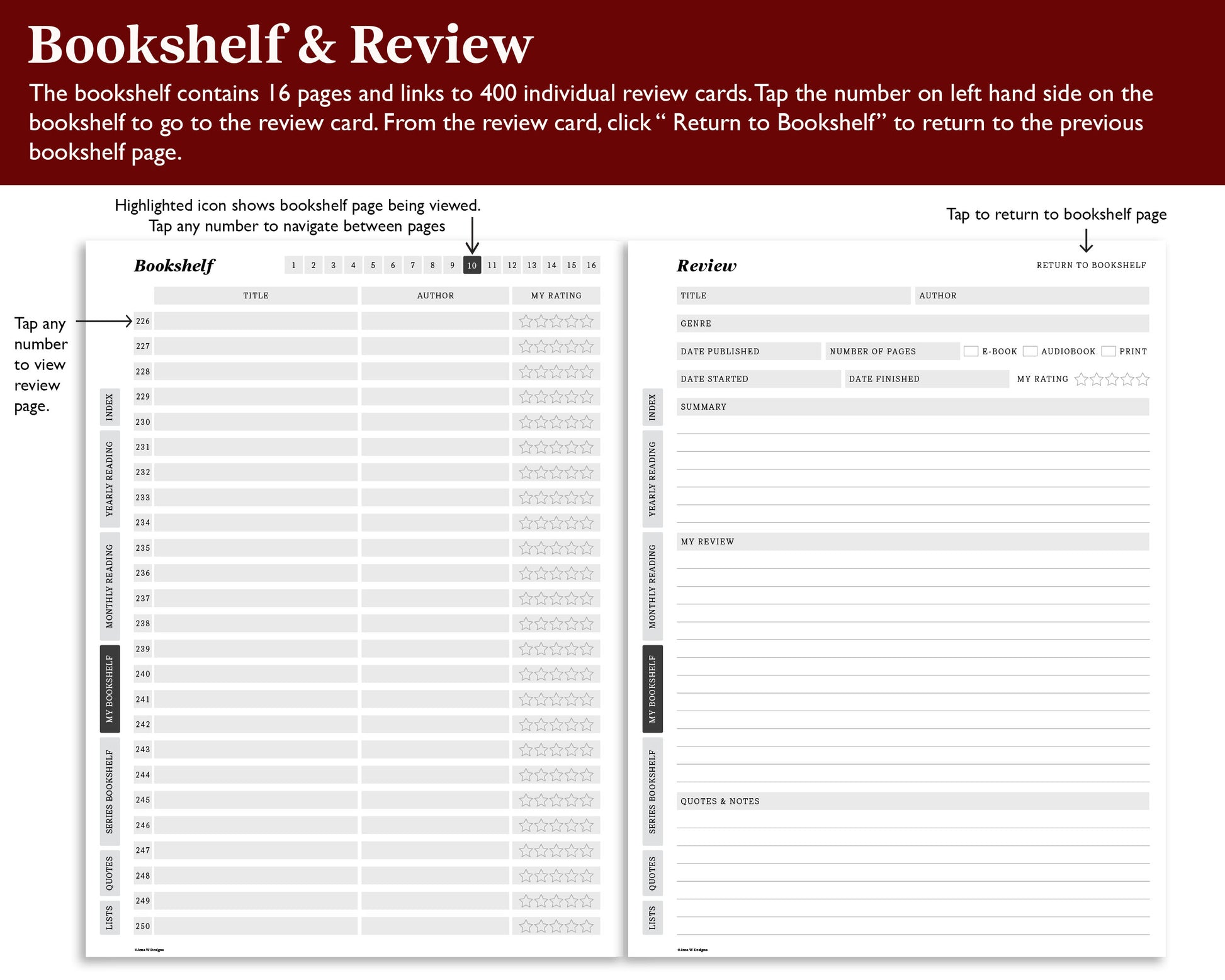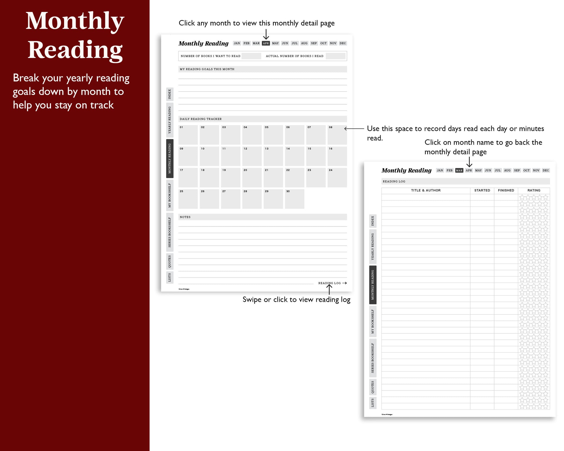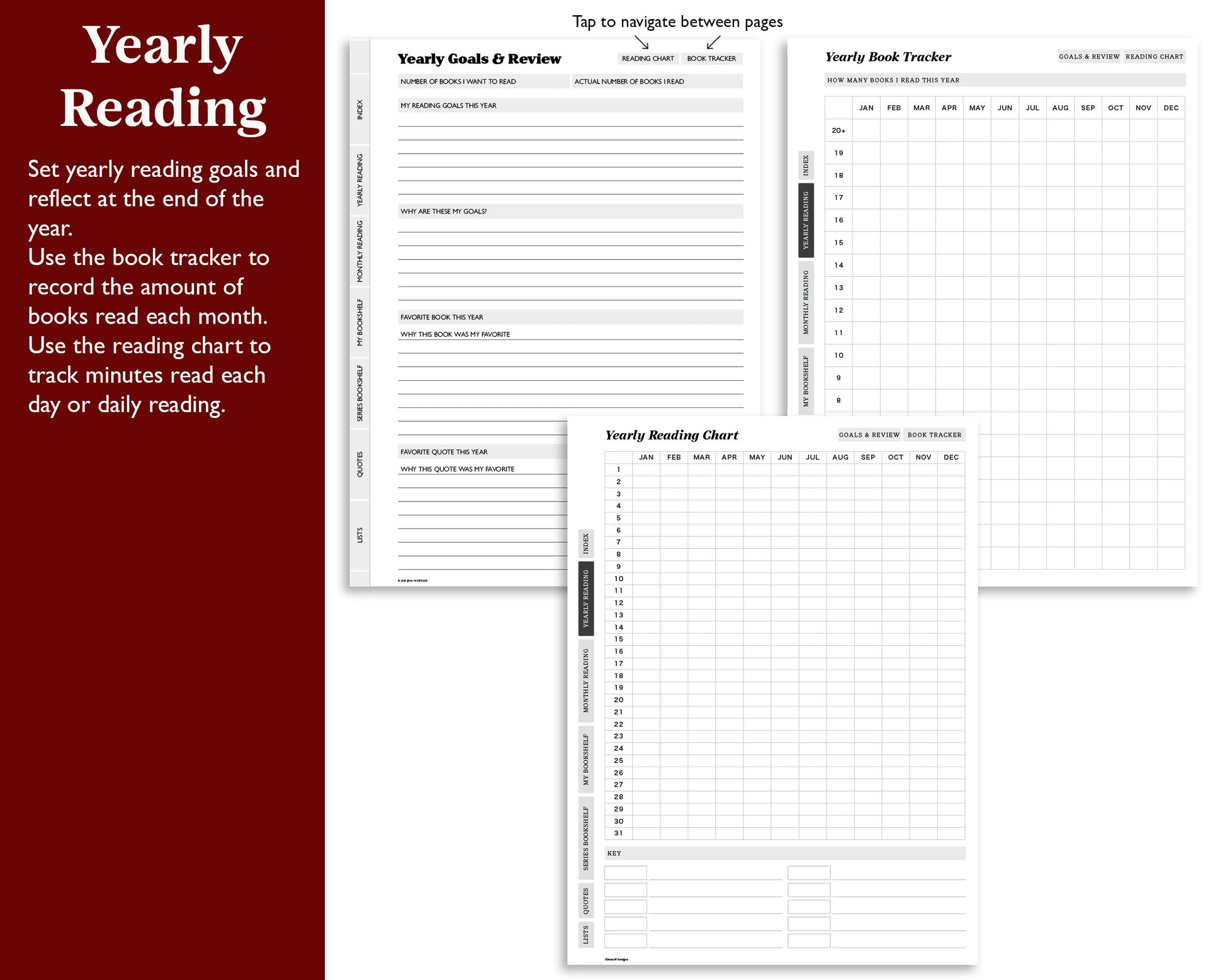 - Monthly and Yearly reading pages to track minutes read, books read, reading goals and more