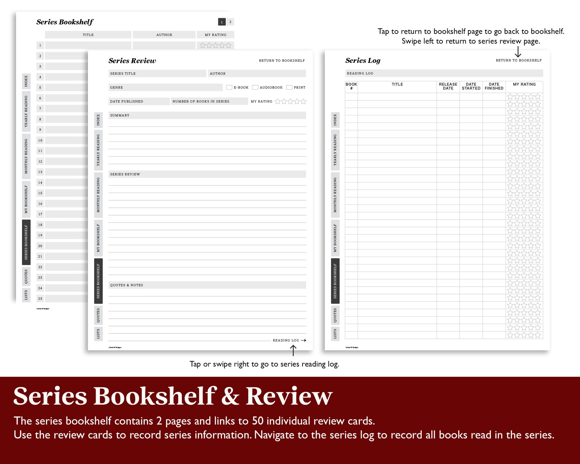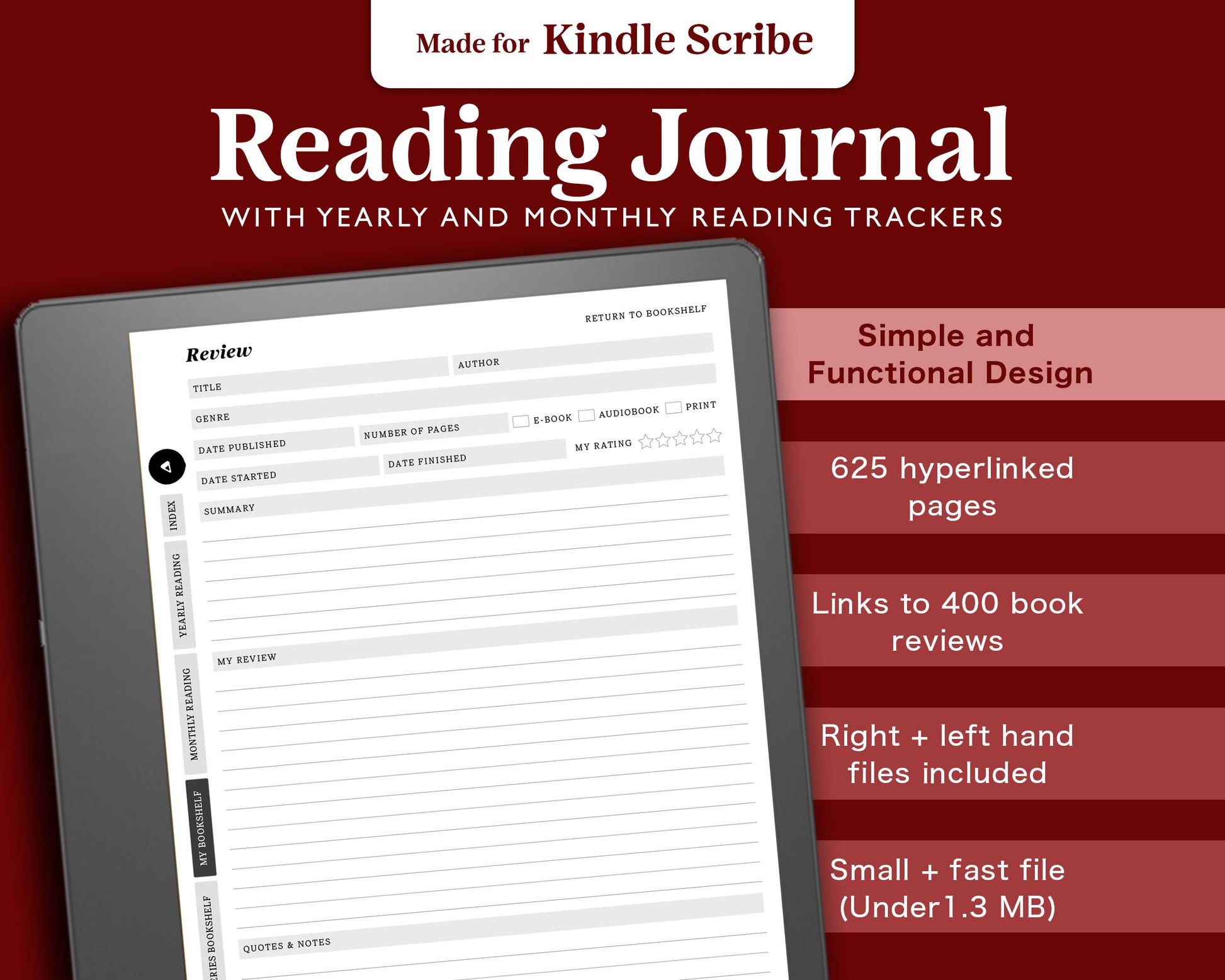Organize your yearly reading with a simple and easy to use reading journal made for your Kindle Scribe tablet. This e-ink book tracker has monthly and yearly goals and trackers, holds 400 book reviews, 50 series, 462 favorite quotes and lists to keep track of all the books to read.