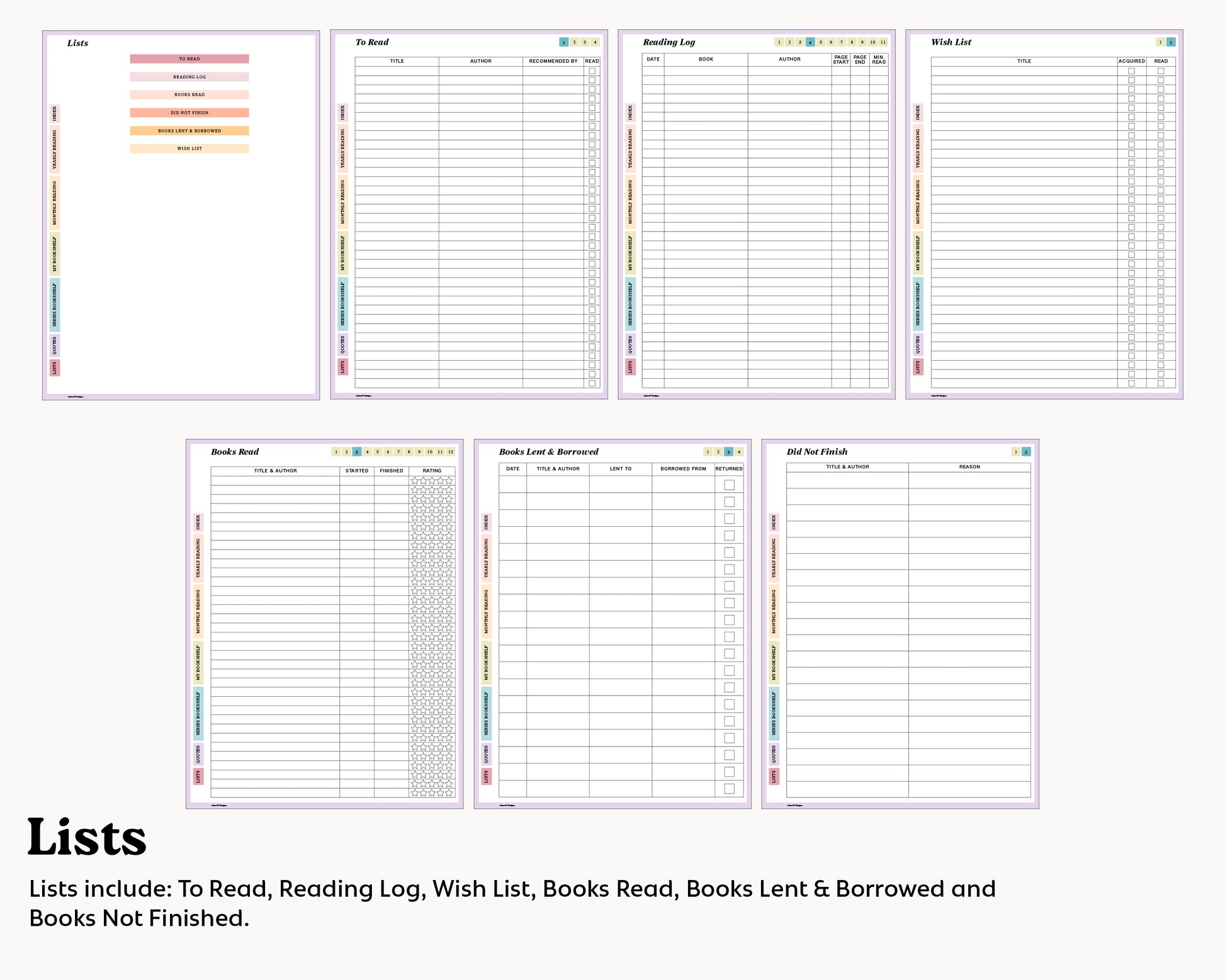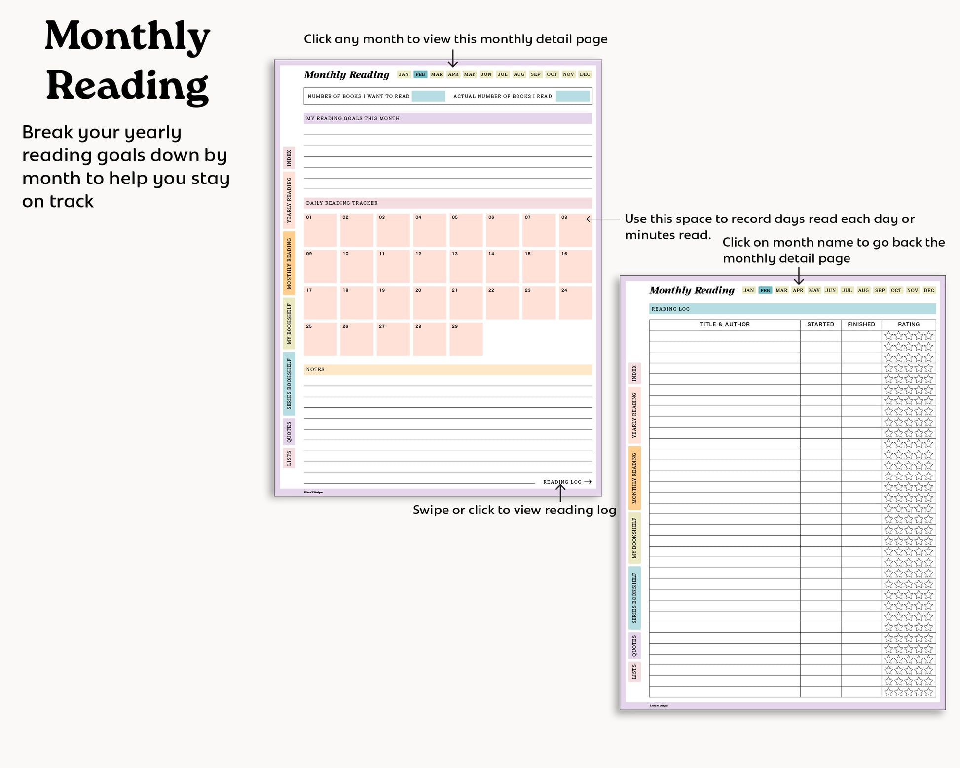 - Monthly and Yearly reading pages to track minutes read, books read, reading goals and more