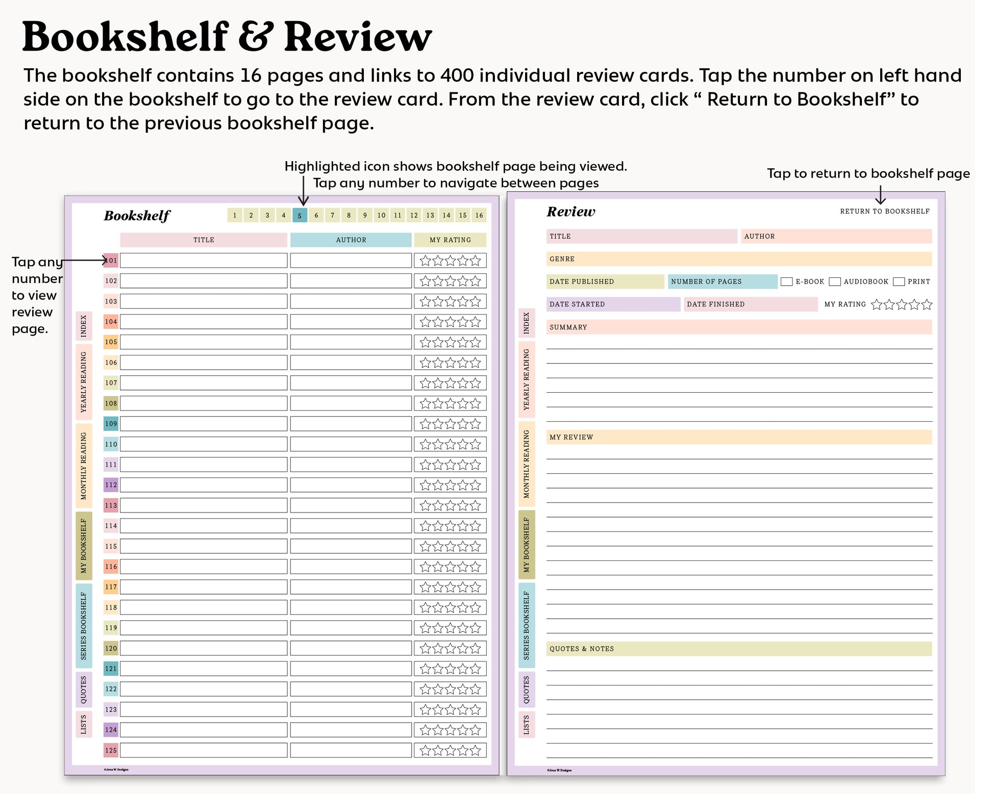 This cozy digital reading journal helps you track your books at a glance or dive deeper into thoughtful reviews. With space for monthly and yearly reading goals, you can stay motivated while keeping everything neatly organized in one place.