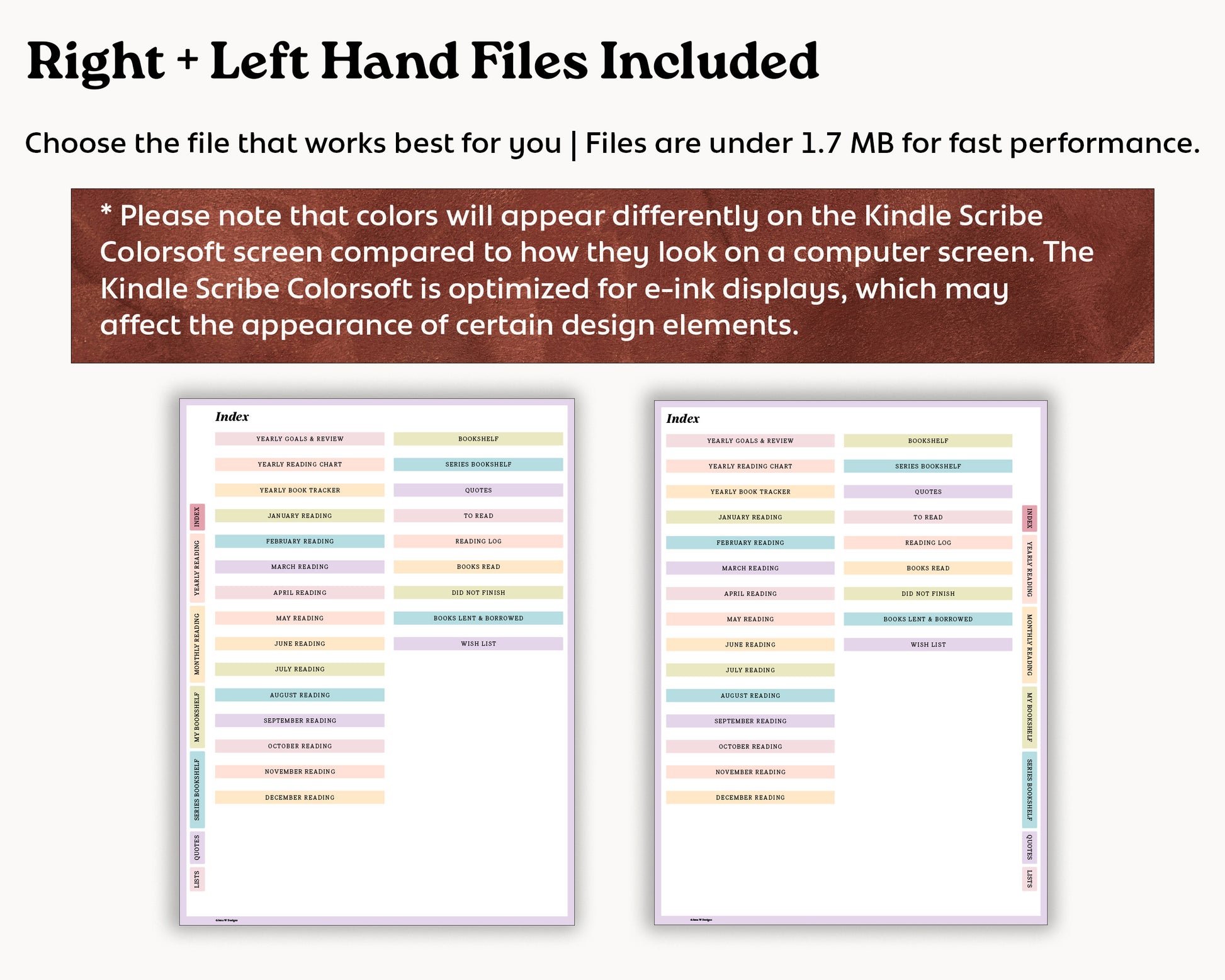 This high-quality pdf planner has a small file size of under 1.7 MB. Left and right-handed versions are included.