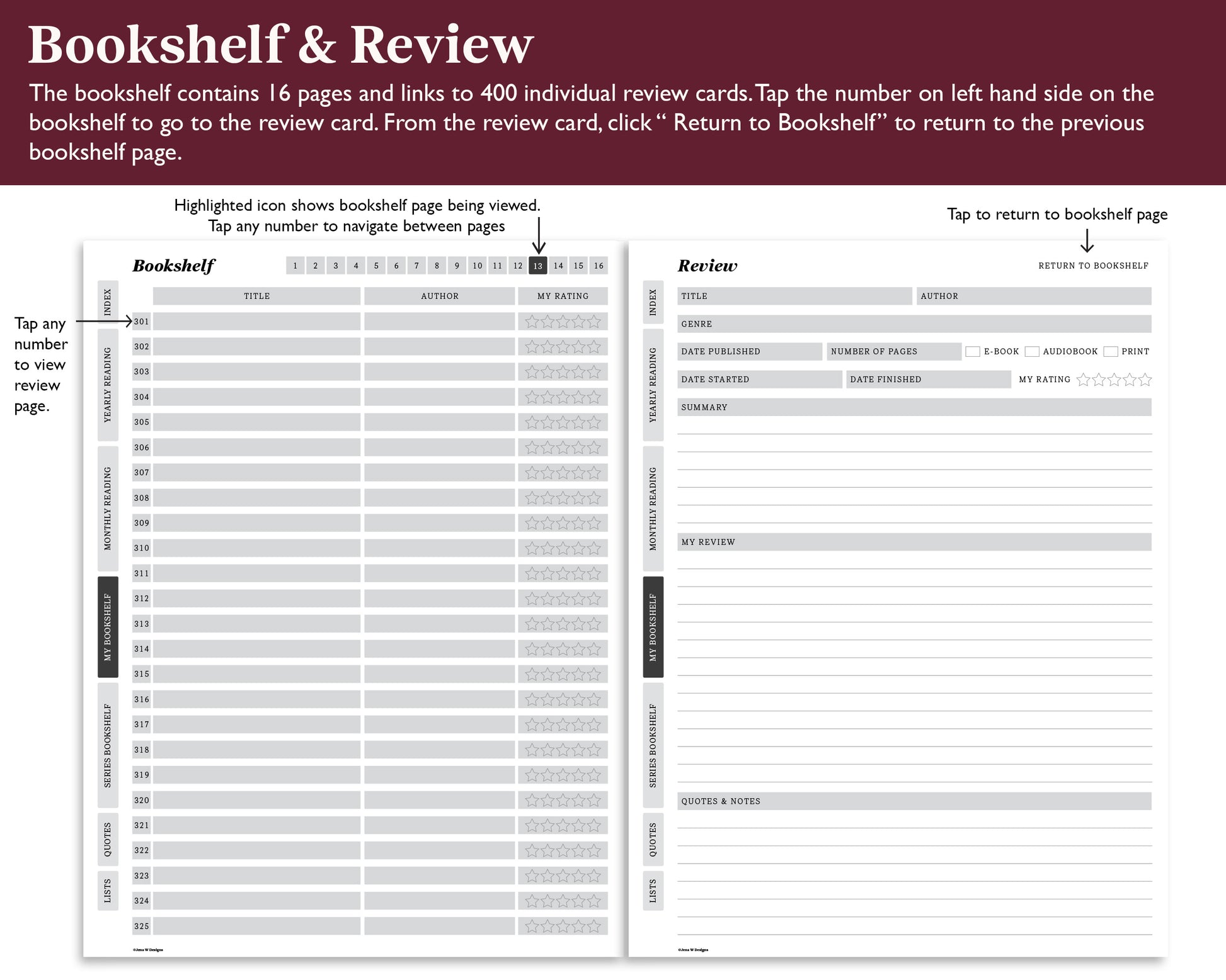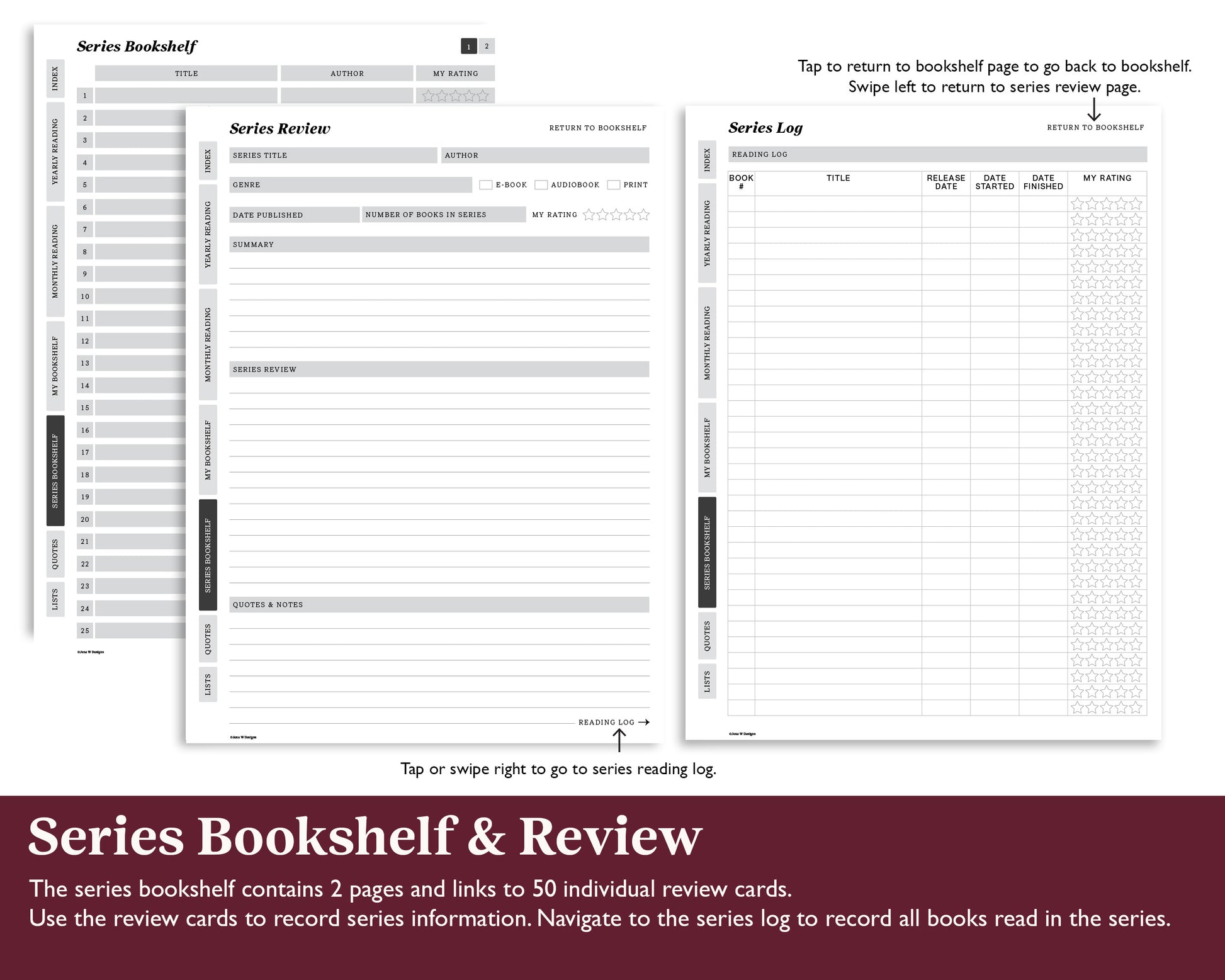 Organize your yearly reading with a simple and easy to use reading journal for your Supernote tablet. This e-ink book tracker has monthly and yearly goals and trackers, holds 400 book reviews, 50 series, 462 favorite quotes and lists to keep track of all the books to read.
