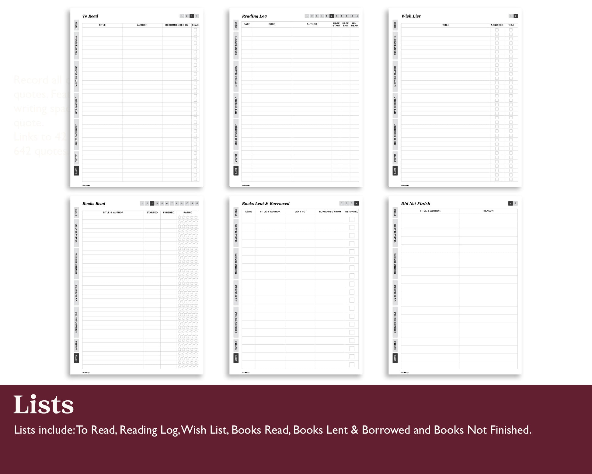 - Monthly and Yearly reading pages to track minutes read, books read, reading goals and more