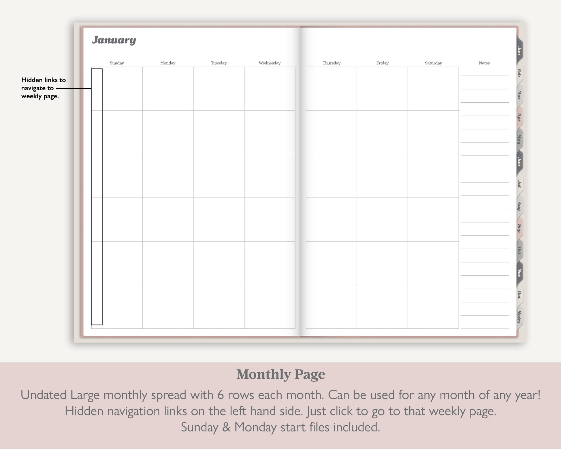 Record your plans and to do's in a simple and minimal focus digital planner. This hyperlinked digital agenda is undated so you can use it year after year. It features a large monthly calendar and a two page weekly layout with plenty of room to record your plans and tasks.