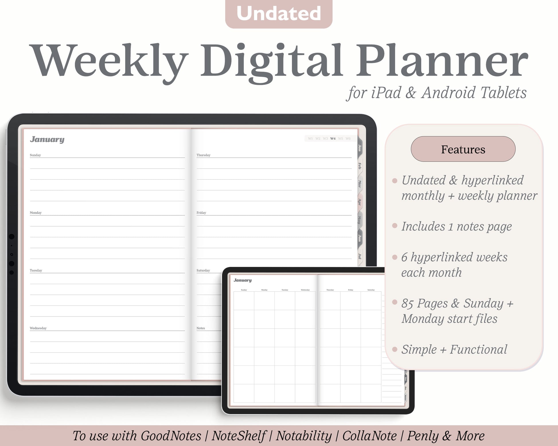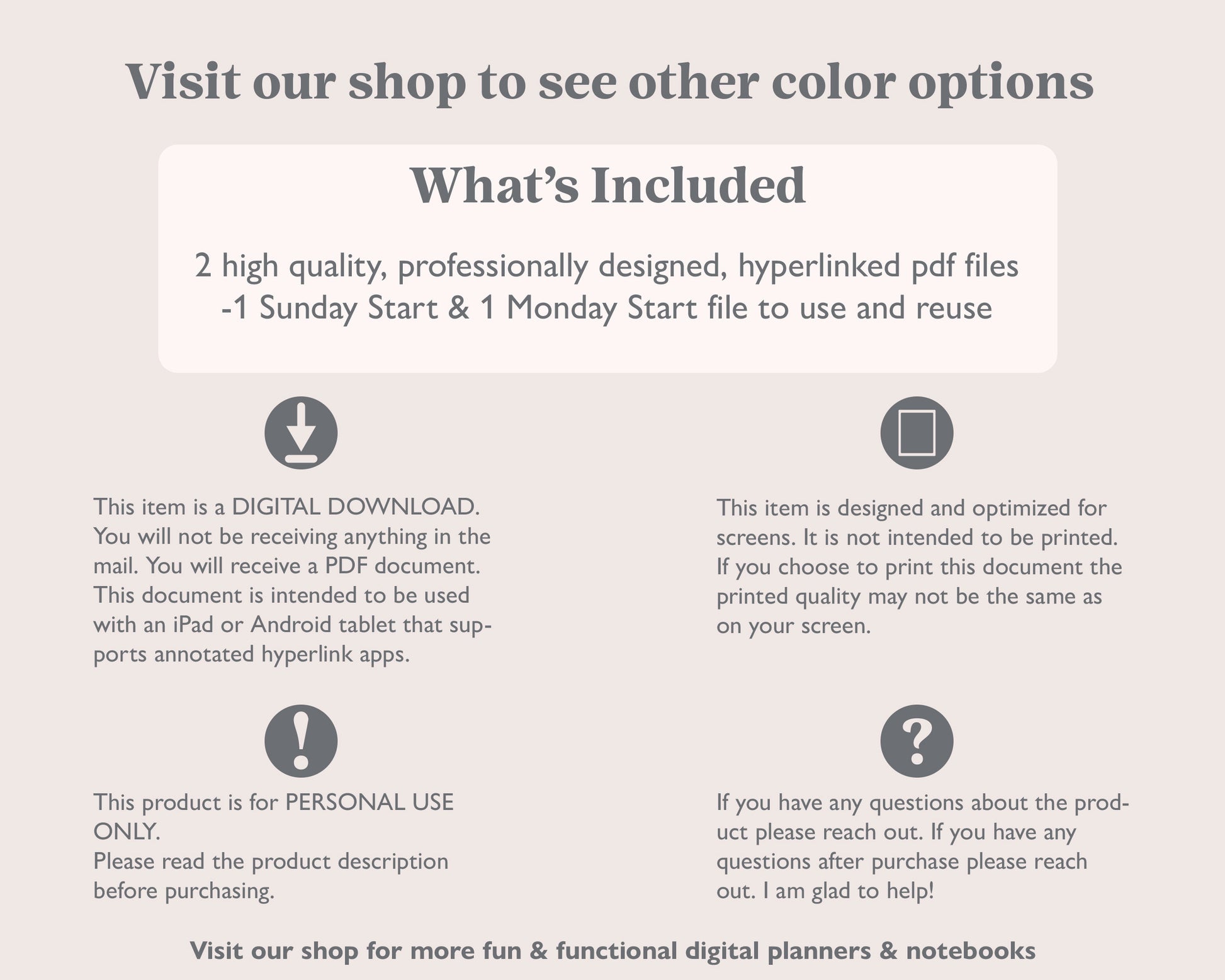 - 2 hyperlinked pdf file of your digital planner ( 1 Sunday & 1 Monday Start) to use in your preferred annotated hyperlink app such as GoodNotes. Review the compatibility tab if you would like to learn more about apps that work with digital pdf templates.